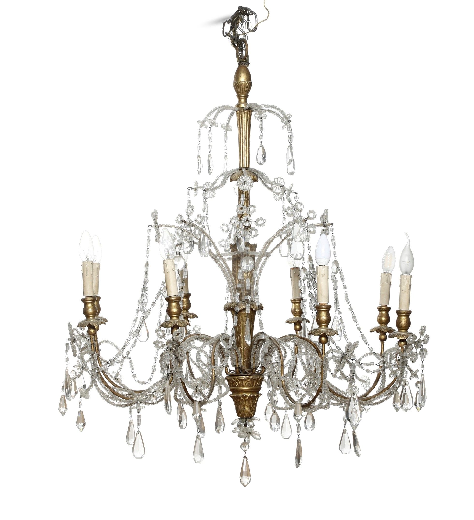 Lampadario in legno dorato e cristalli. XVIII secolo