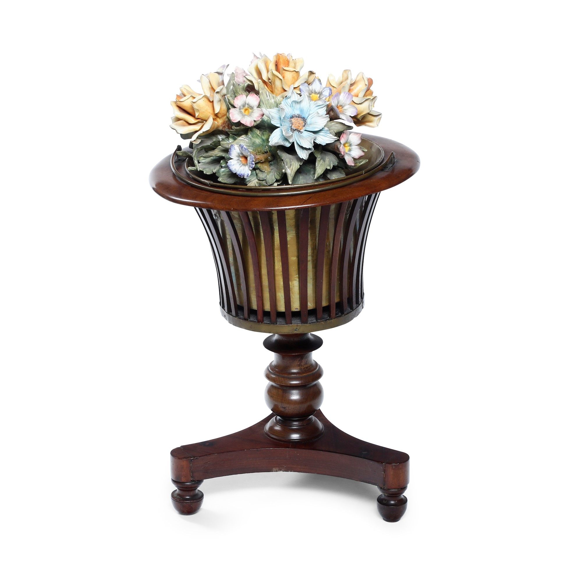 Portafiori Biedermeier in legno con fiori in ceramica. XIX secolo