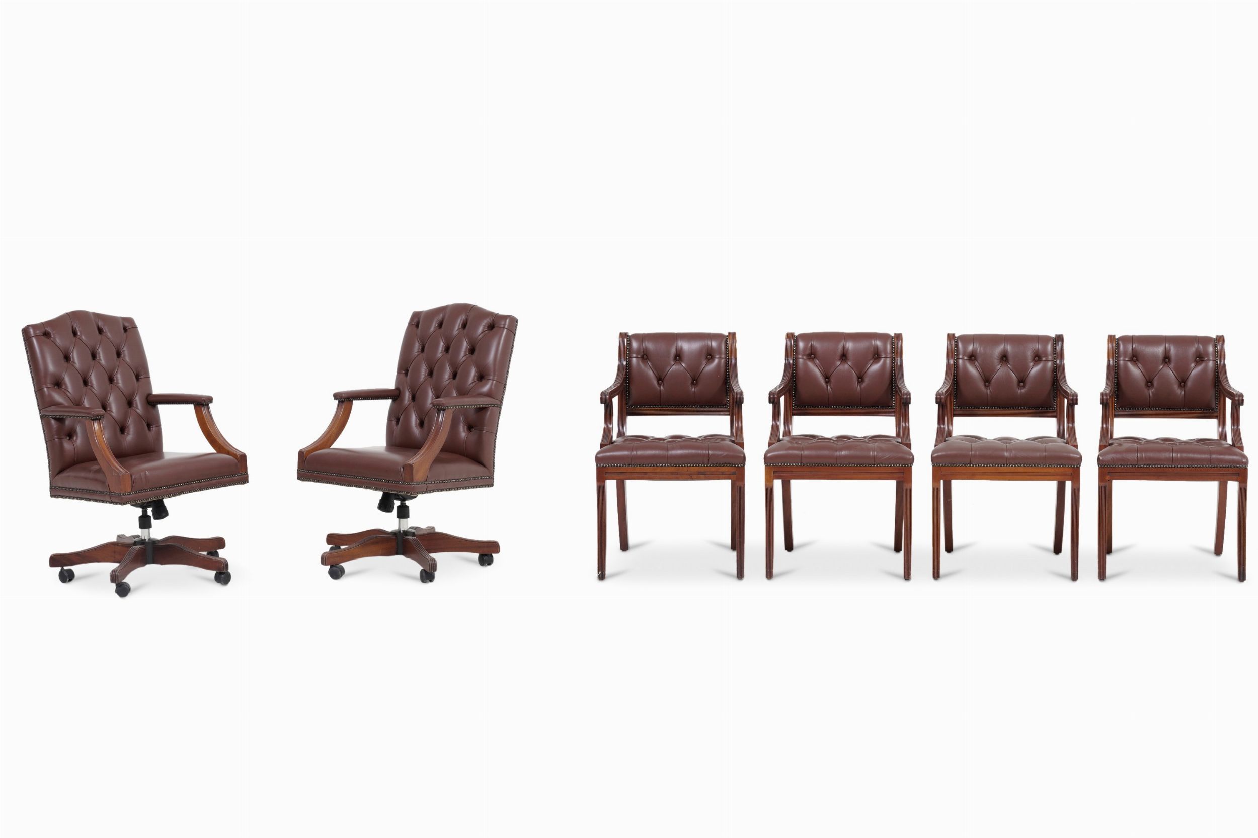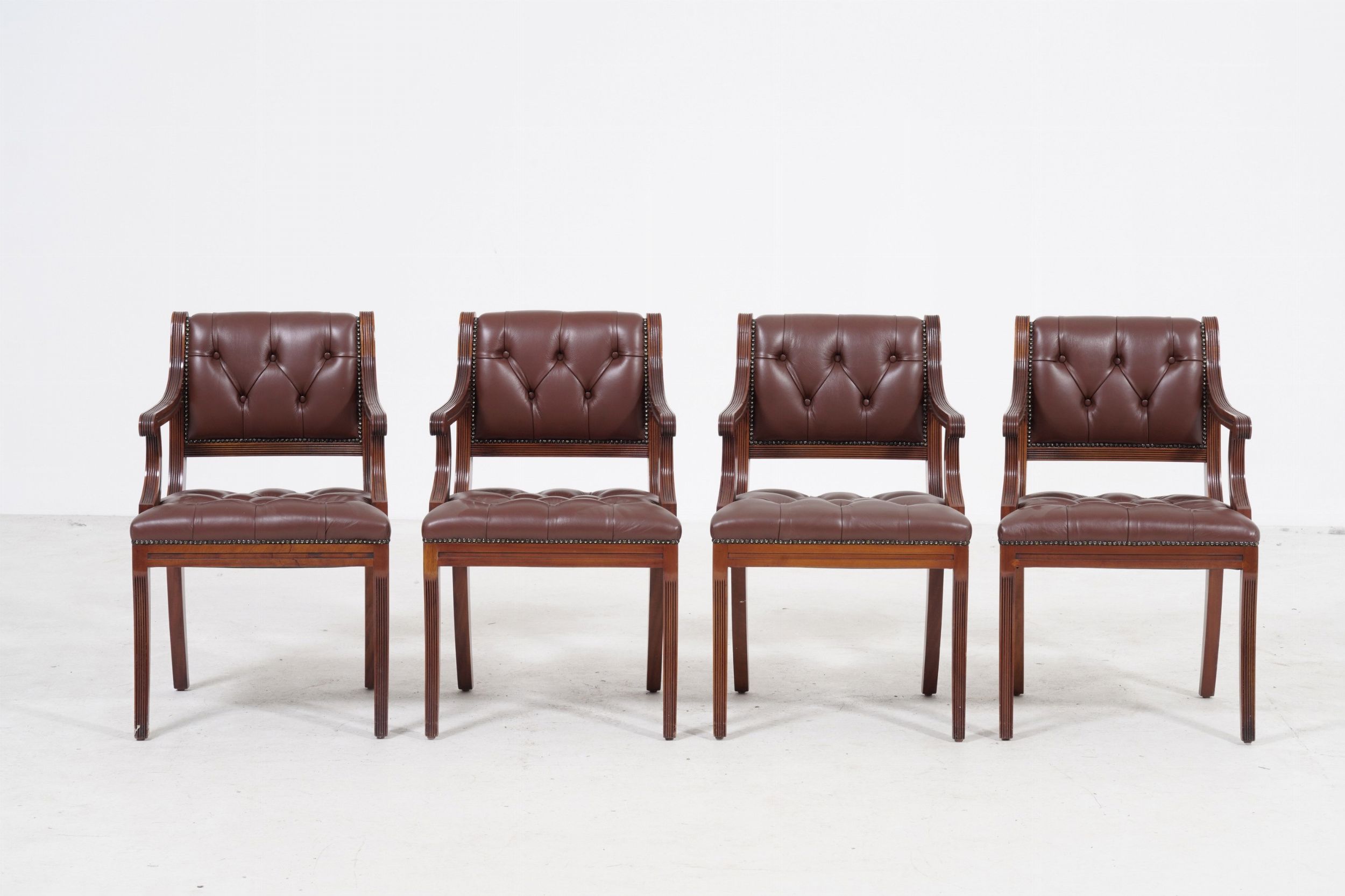 Sei poltroncine in legno intagliato e pelle. XX secolo