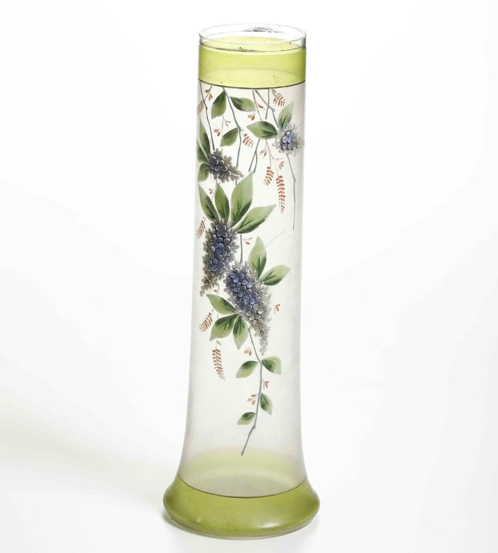 Vaso in vetro di forma oblunga decorato con glicini in rilievo e dorature. Forse [..]