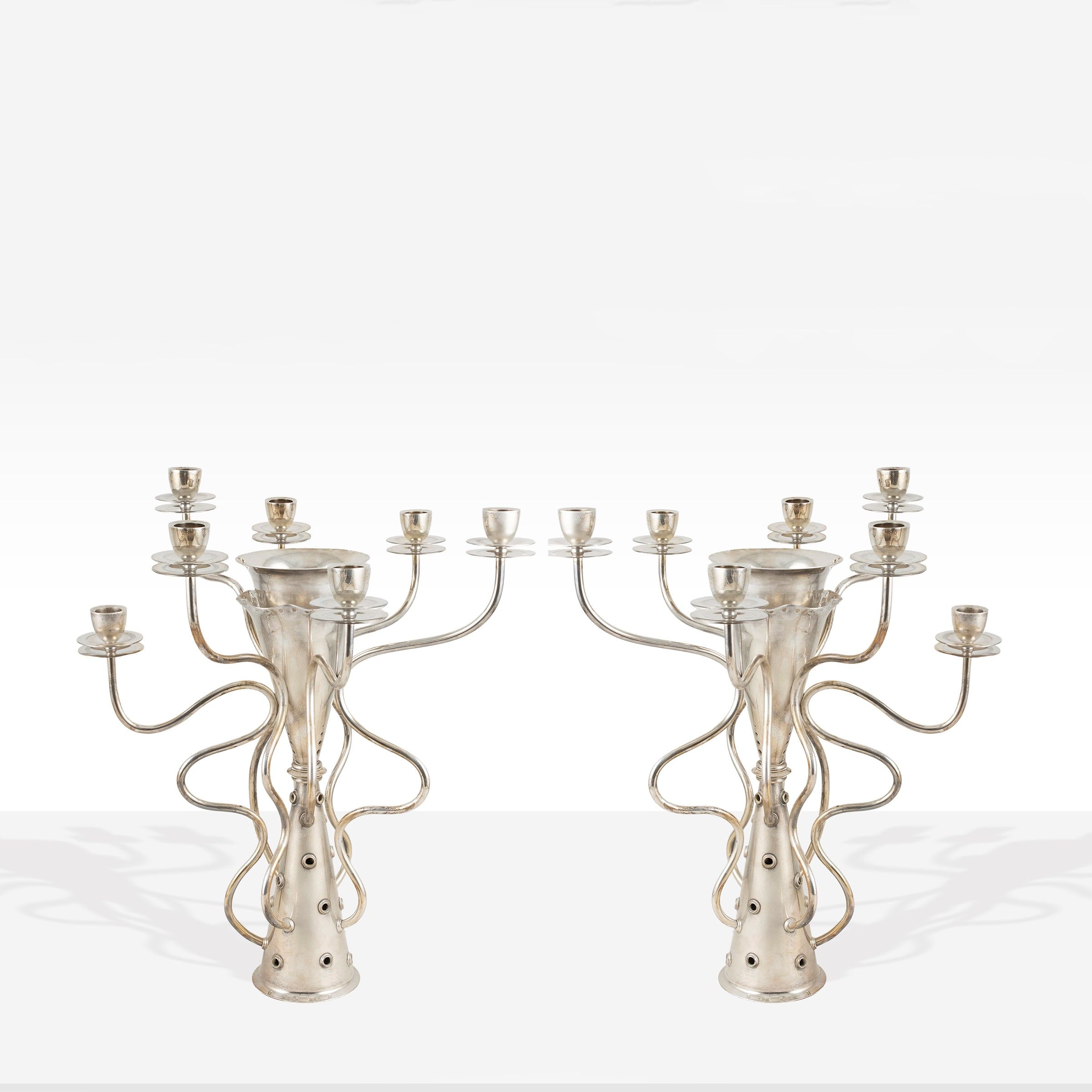Italia, 1989 coppia di candelabri mod. Simon in metallo argentato, marchio della produzione
