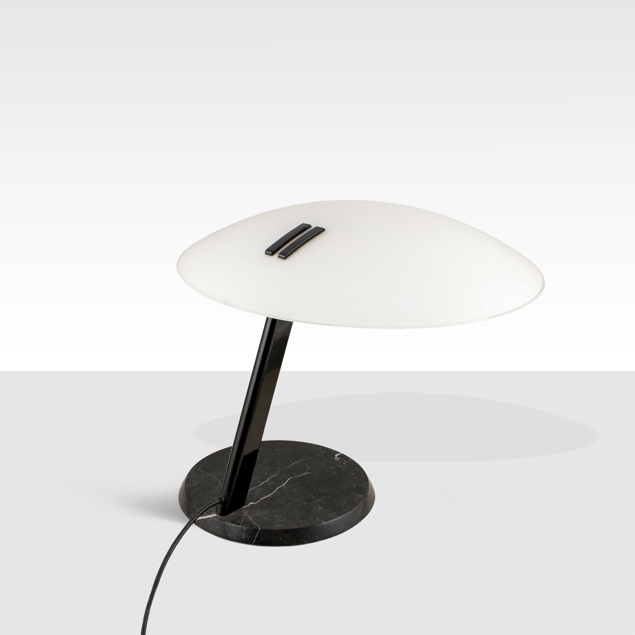 Italia, anni 70 lampada da tavolo mod. Perla in metallo verniciato, vetro opalino e base in marmo, etichetta della produzione, difetti