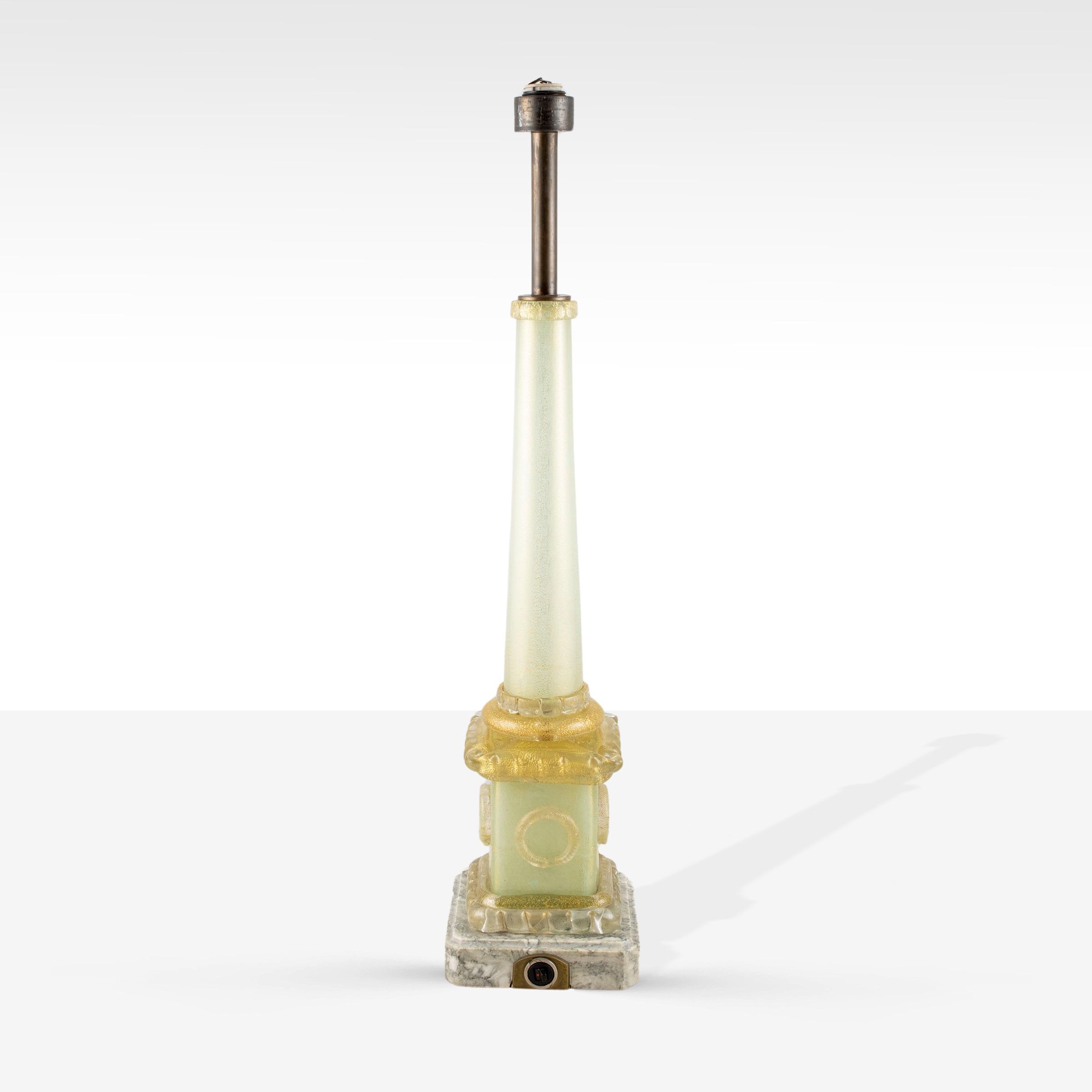 Murano, anni 60 lampada da tavolo in ottone, vetro soffiato con foglia oro e base in marmo