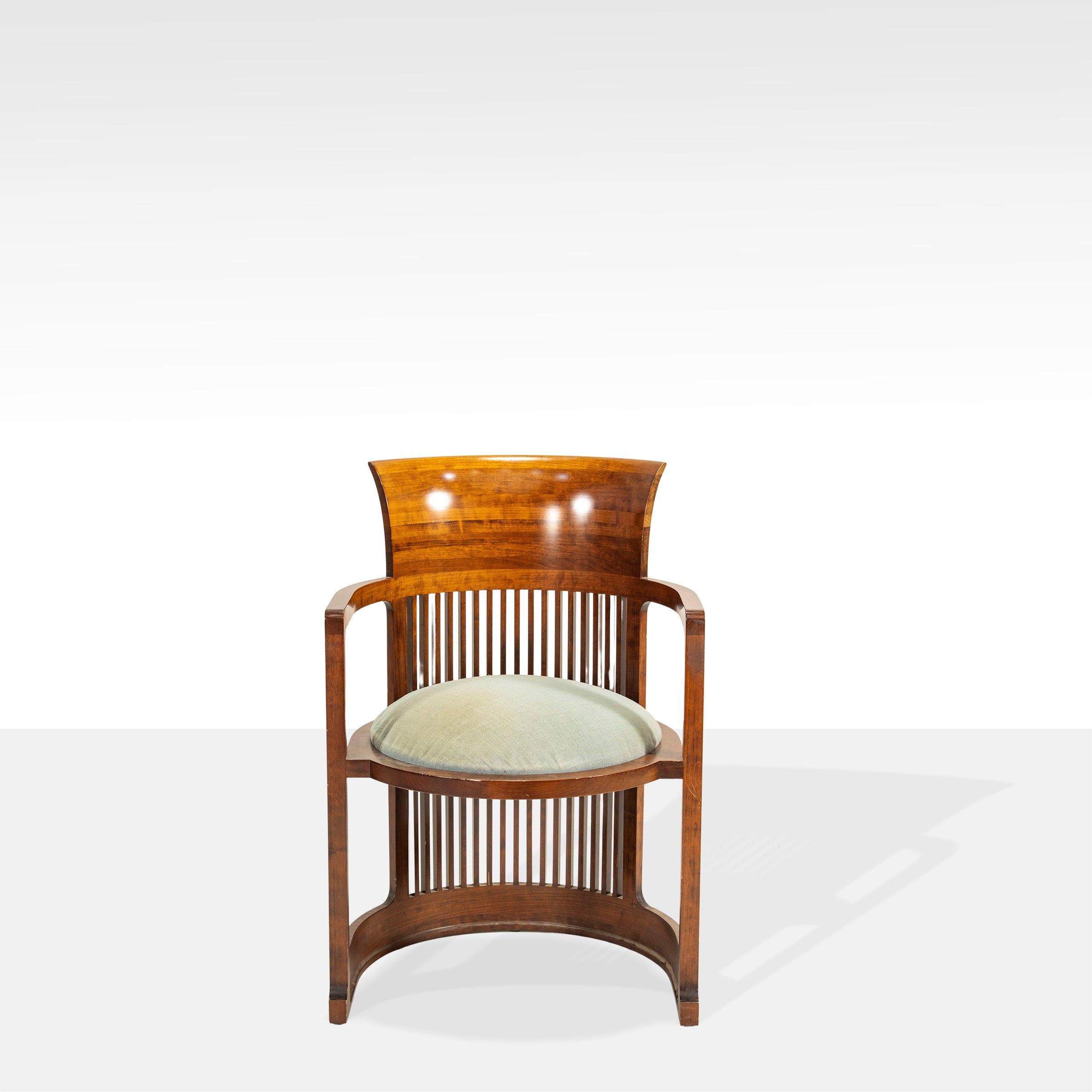 Italia, anni 80 sedia mod. Barrel in legno e tessuto imbottito, marchio della produzione