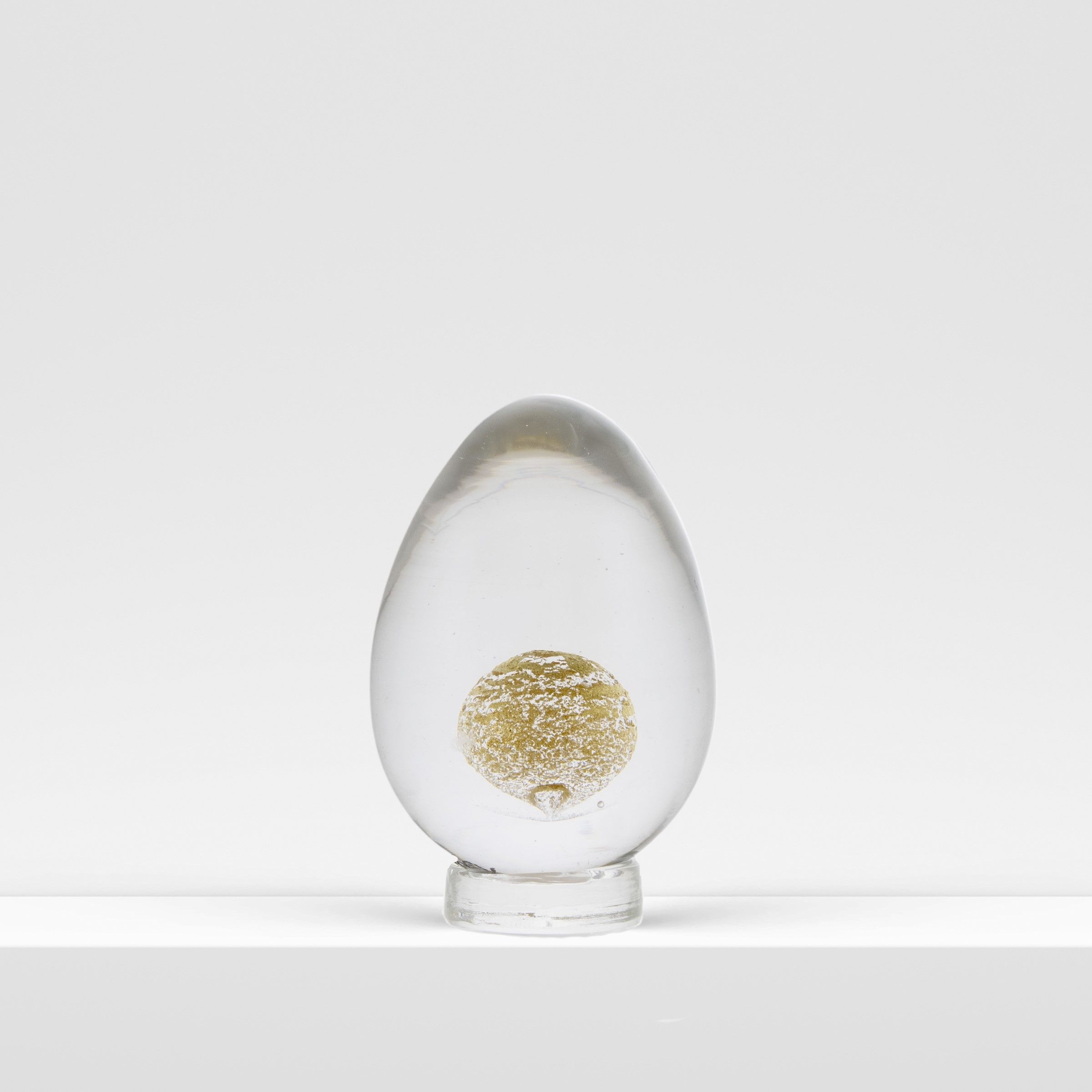 Murano, 1966 uovo in vetro trasparente e palla dorata sommersa, completo di base in vetro, firma incisa Bibliografia: Catalogo Verde, 1968, pag. 7