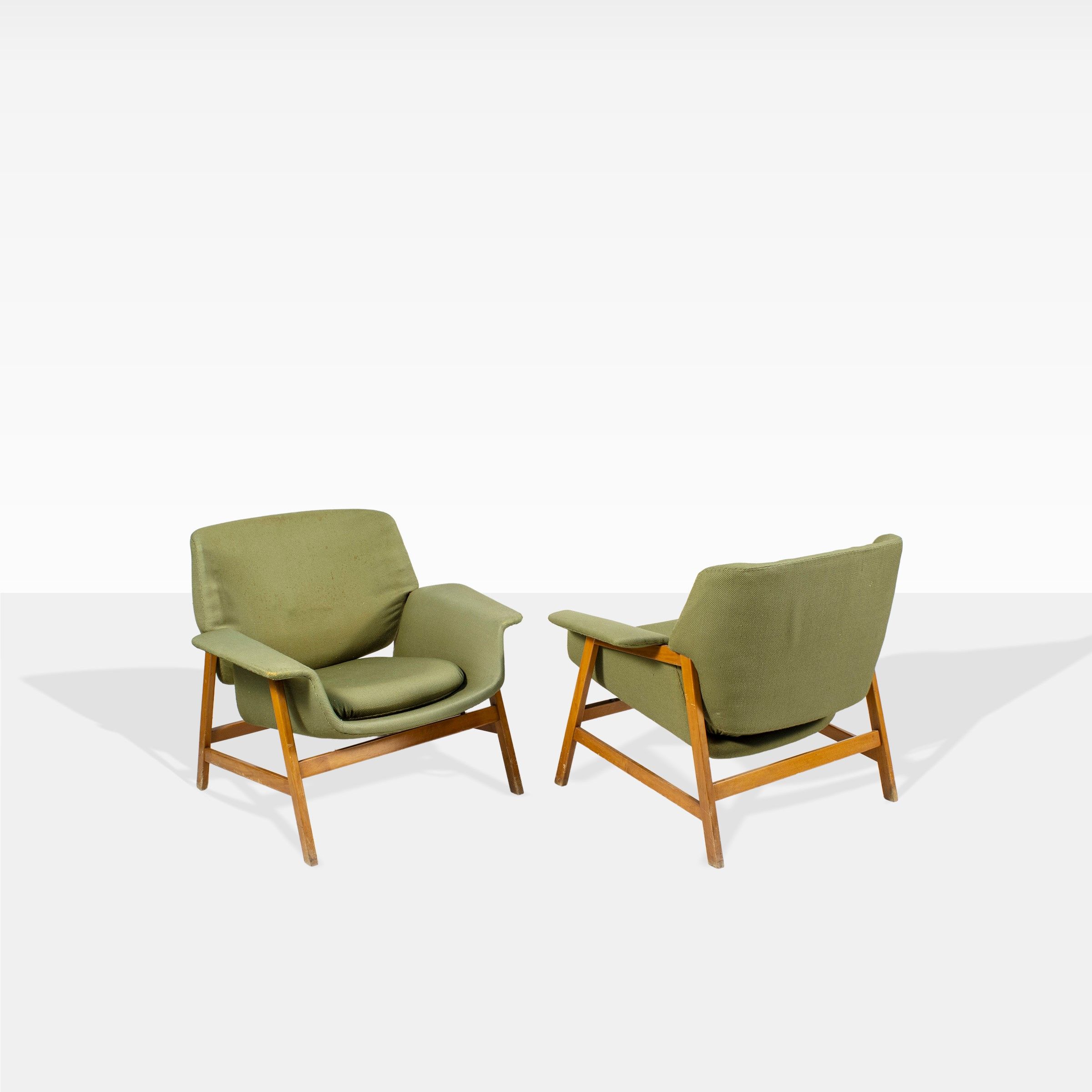 Meda, 1956 coppia di poltrone mod. 849 in legno e tessuto imbottito, lievi usure. Bibliografia: P.C. Santini, Gli anni del design italiano, ritratto di Cesare Cassina, Electa, 1981, pag. 109, 114