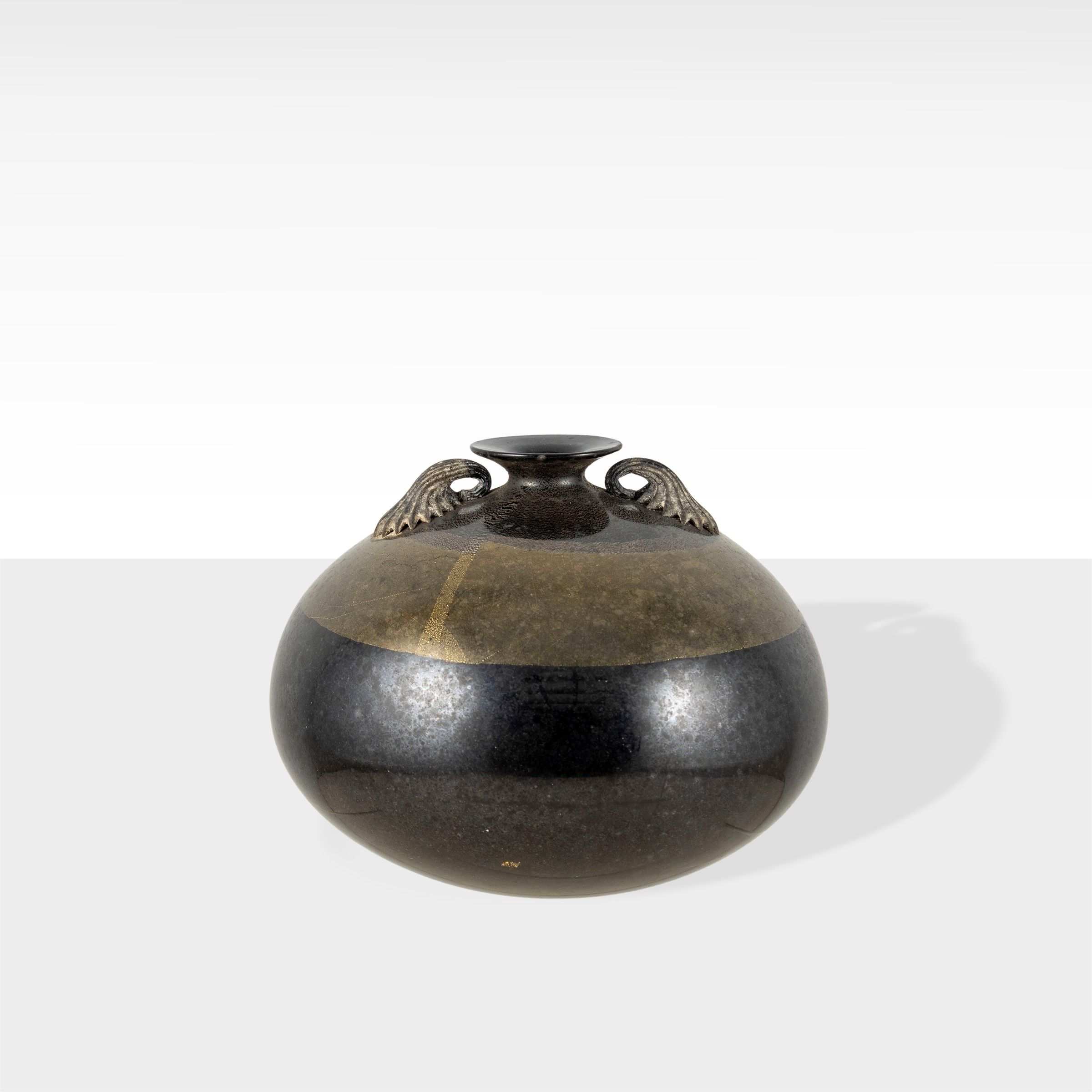 Murano, anni 80 vaso in vetro colorato e foglia d'oro, firma a punta