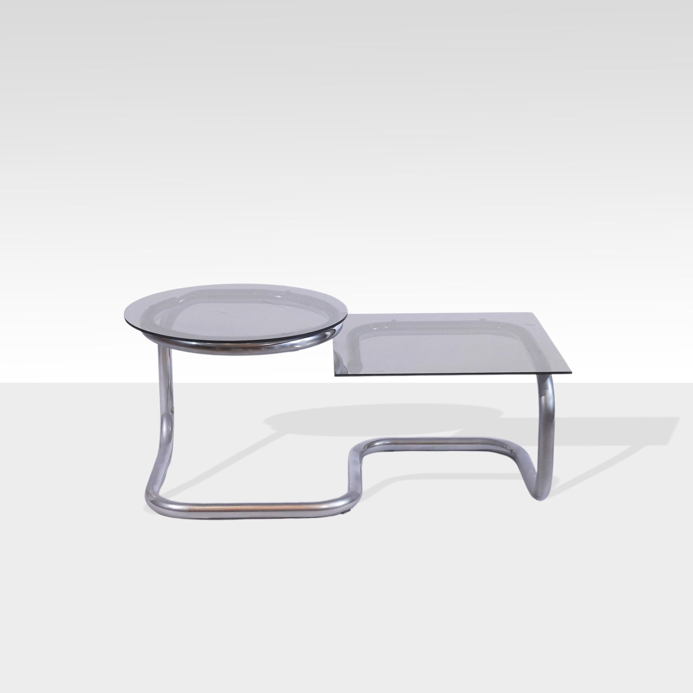 anni 70 tavolino basso in acciaio e vetro specchiato fumè