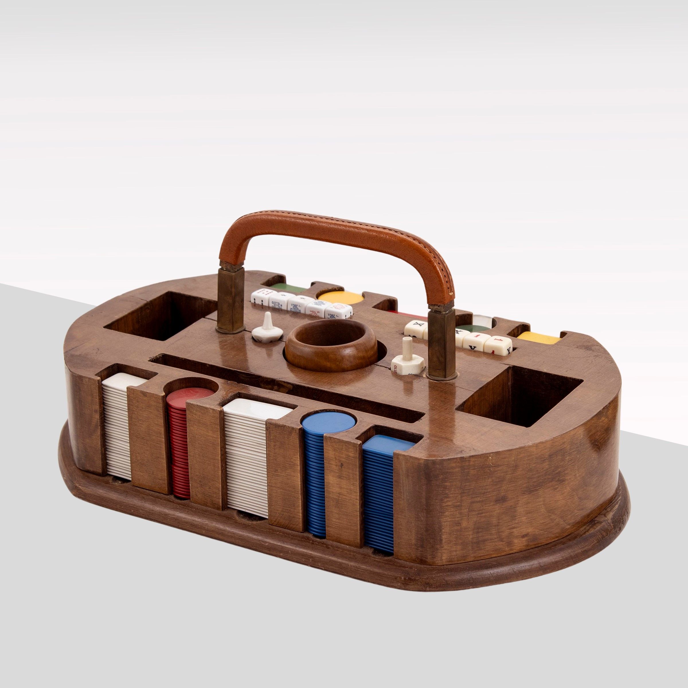 anni 60 set da gioco in legno, ottone e pelle, difetti