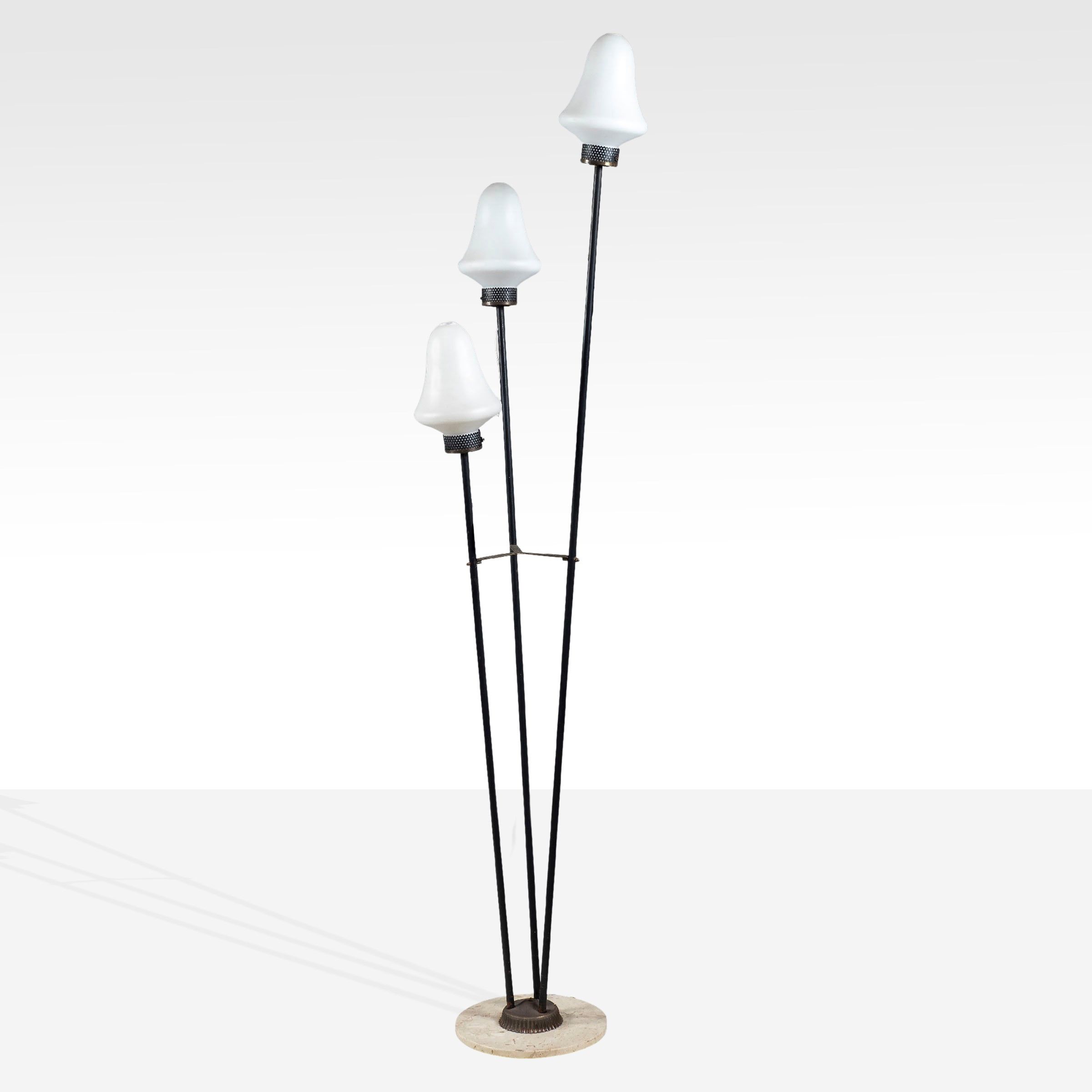 anni 60 lampada da terra in metallo verniciato, ottone, diffusori in vetro opalino e base in marmo
