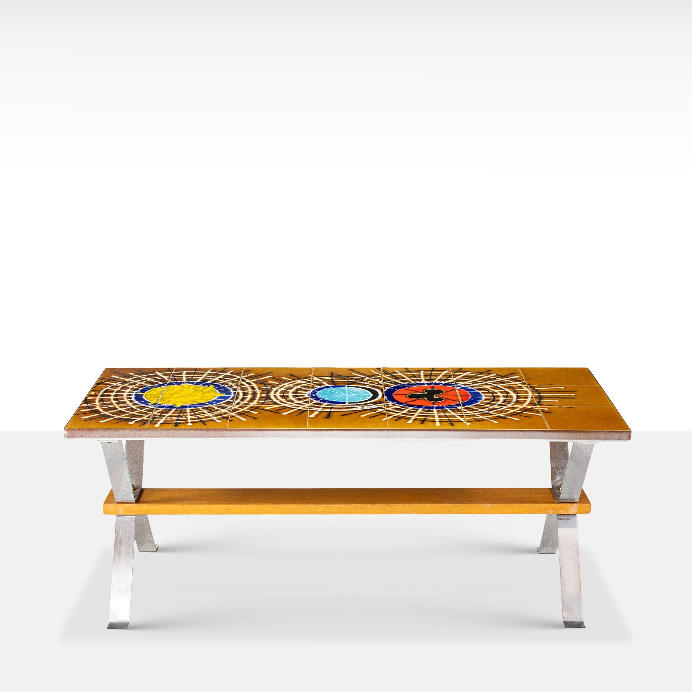 anni 70 tavolino basso in metallo cromato, legno e maiolica policroma