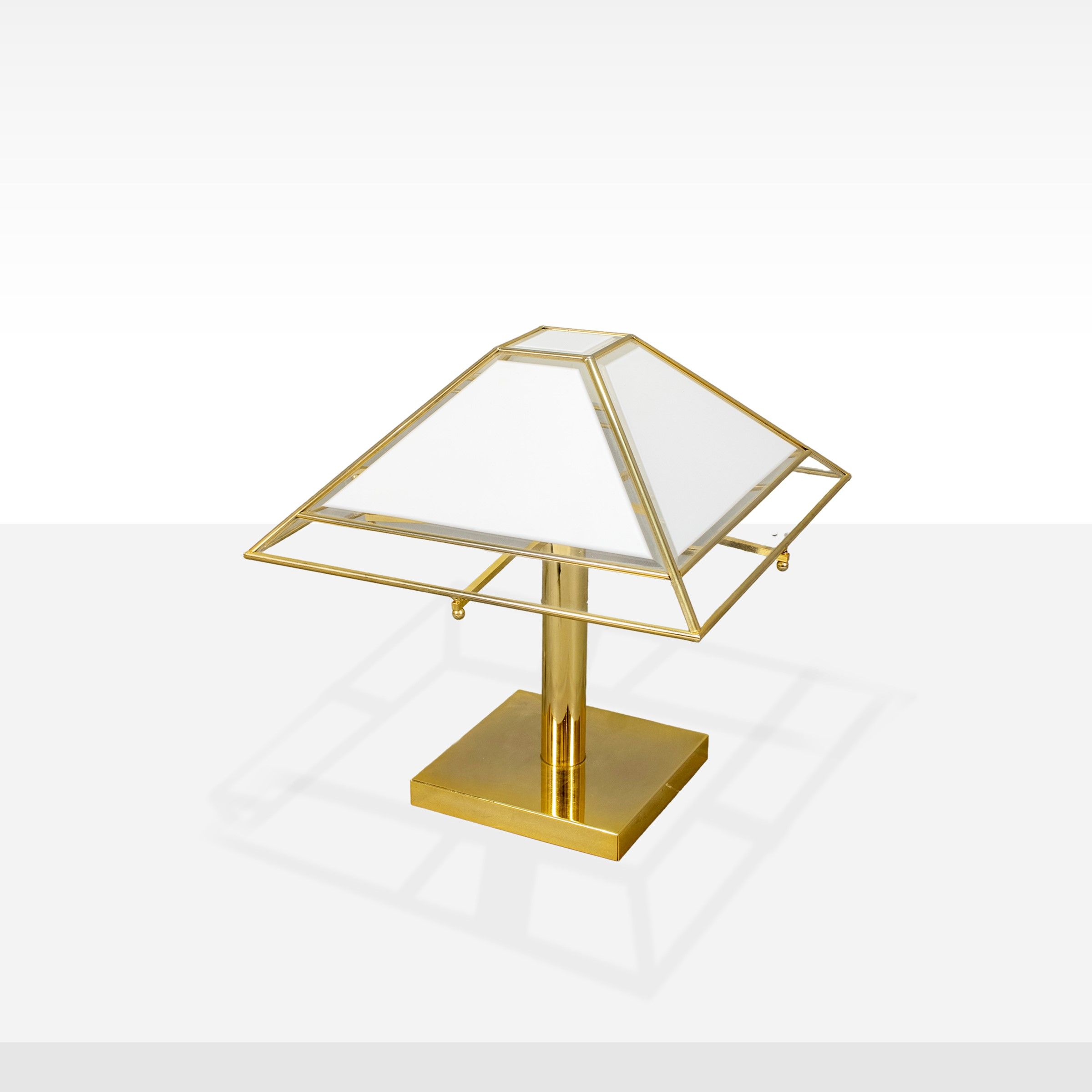 anni 70-80 lampada da tavolo in ottone, vetro trasparente e vetro lattimo