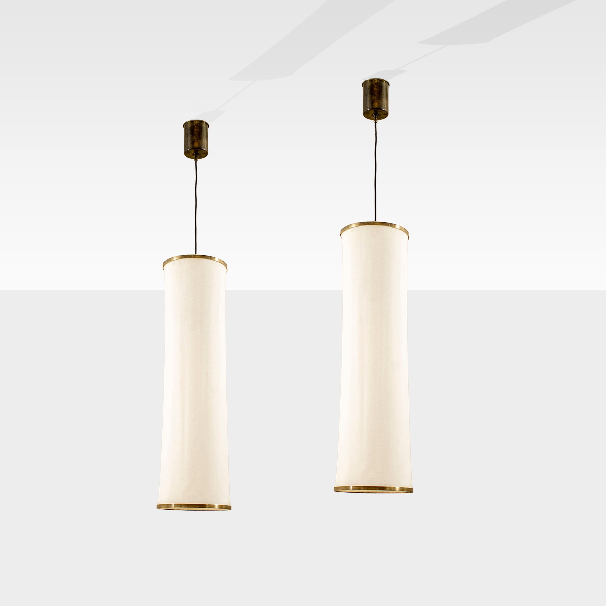 anni 60-70 coppia di lampade a sospensione in ottone e tessuto, usure