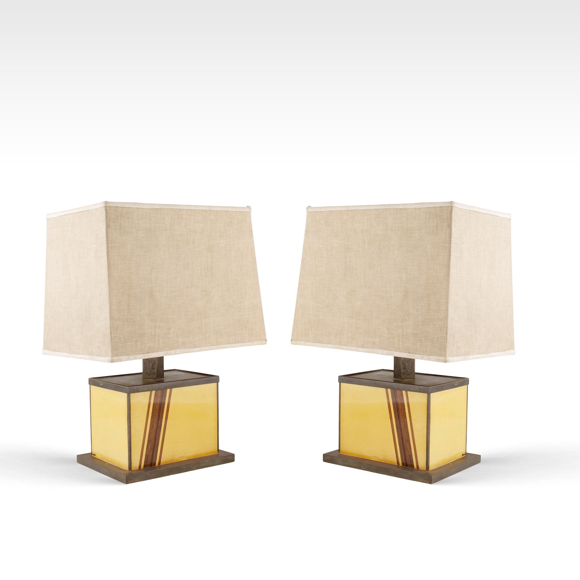 anni 70 coppia di lampade da tavolo in legno ed ottone, complete di paralume
