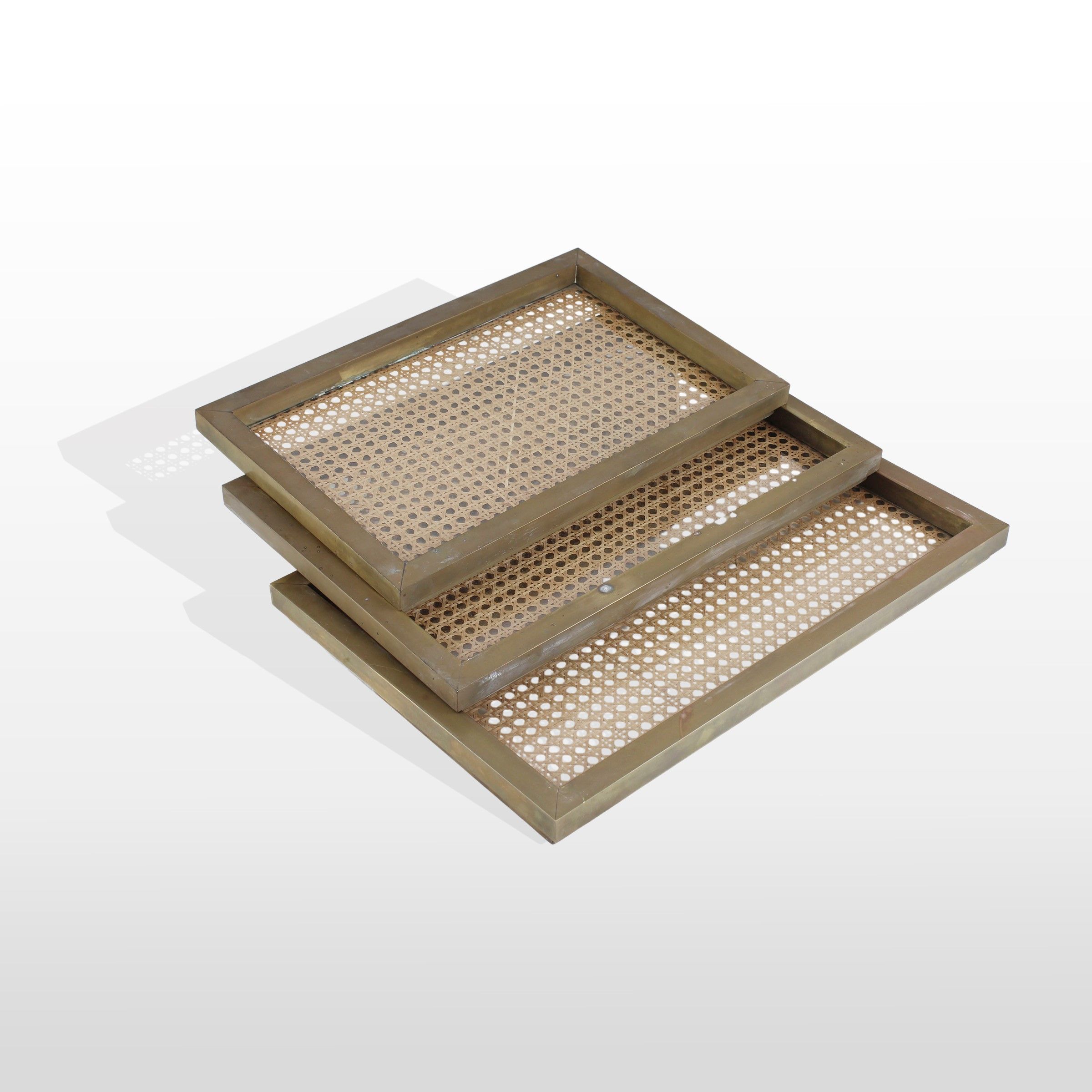 Italia, anni 70 set di tre vassoi in ottone e paglia di vienna, lievi usure