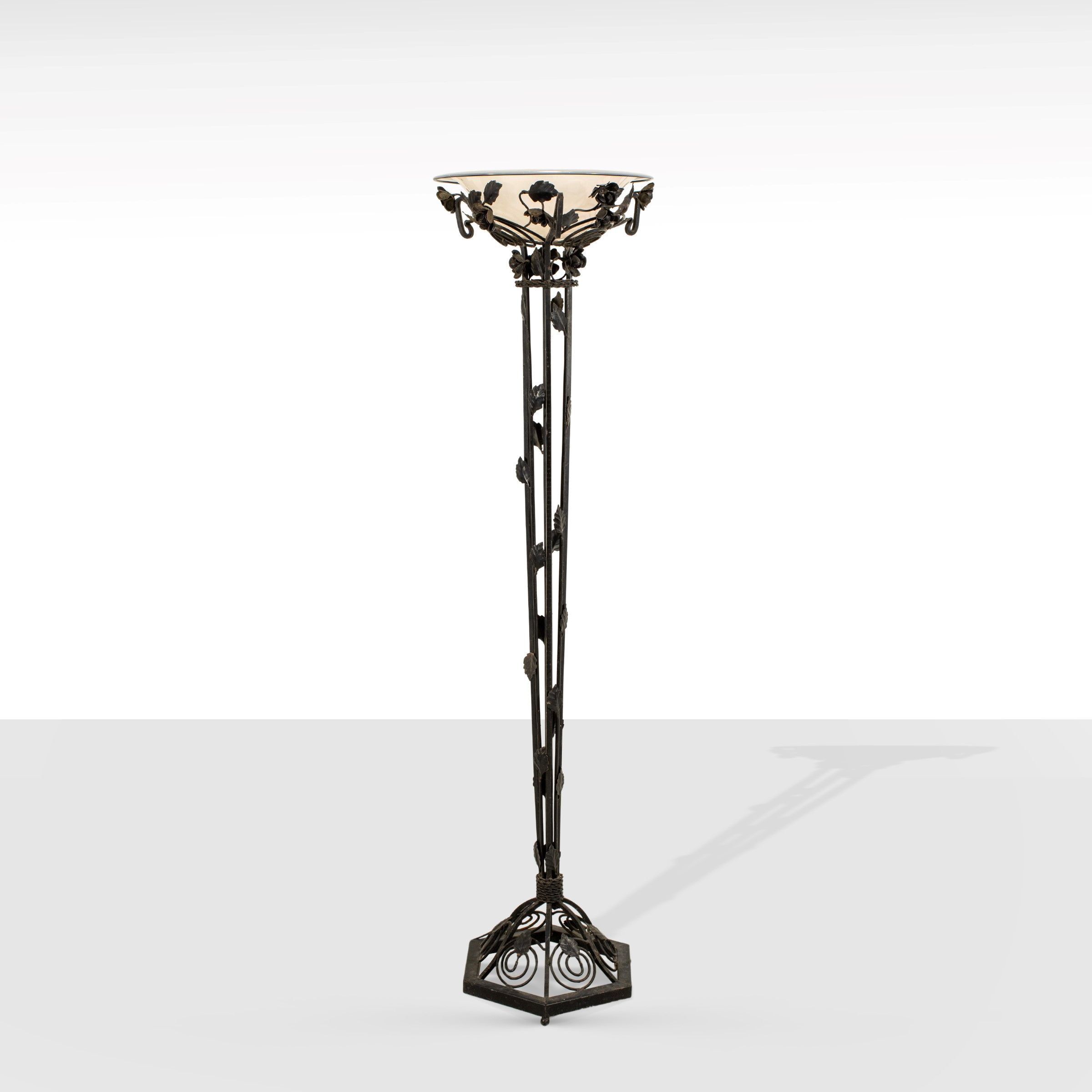 anni 80 lampada da terra in ferro battuto e vetro lattimo