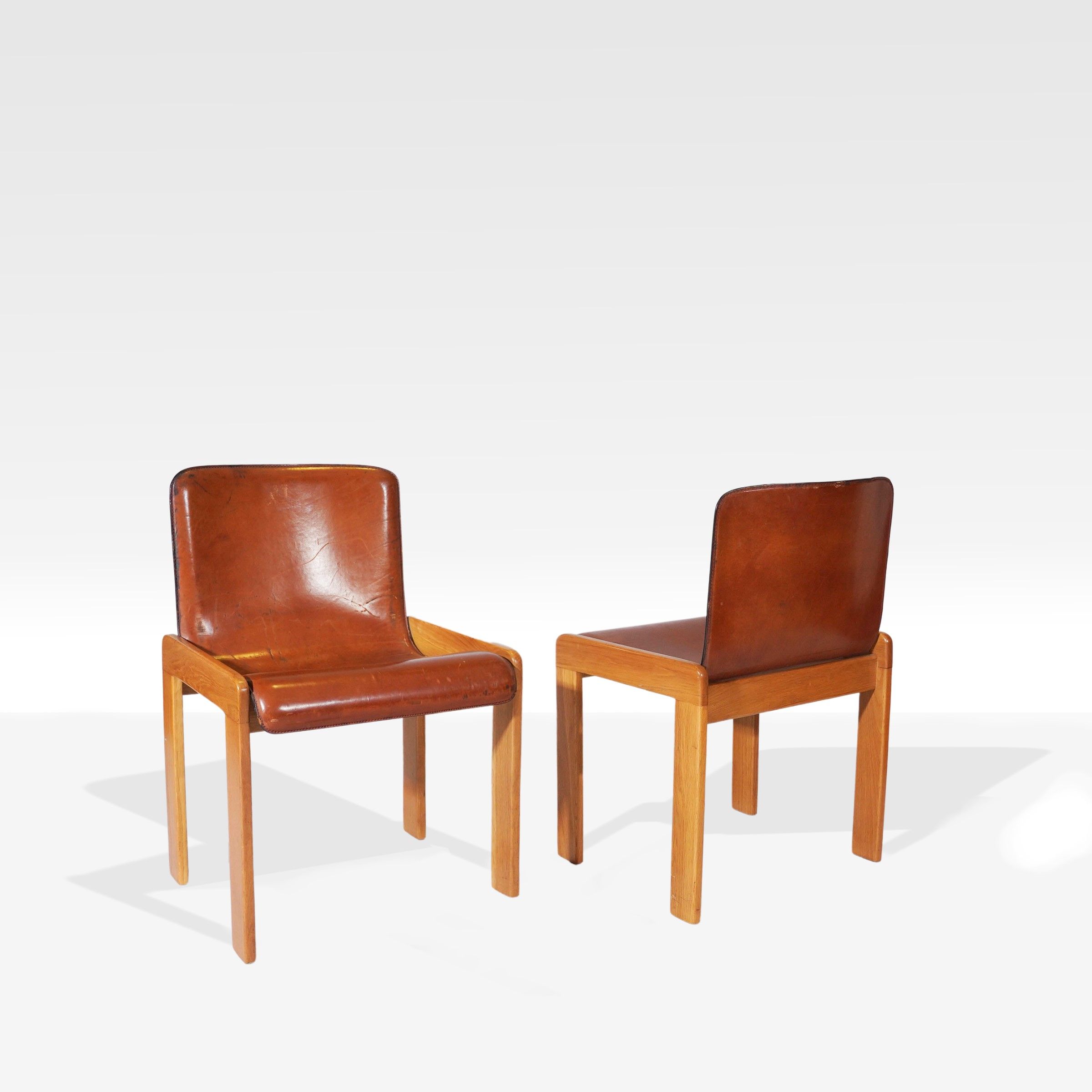anni 60 quattro sedie in legno e pelle, usure