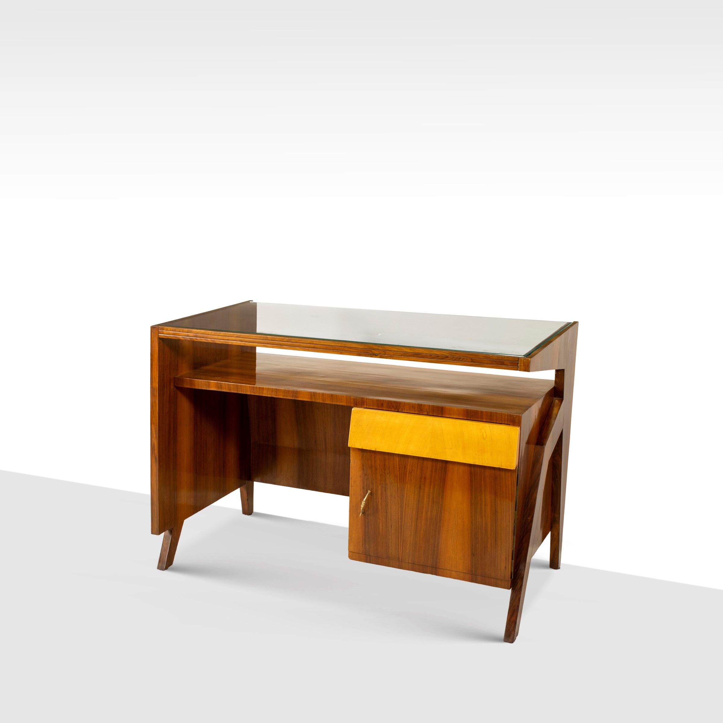 anni 50-60 scrivania in legno, ottone e vetro trasparente