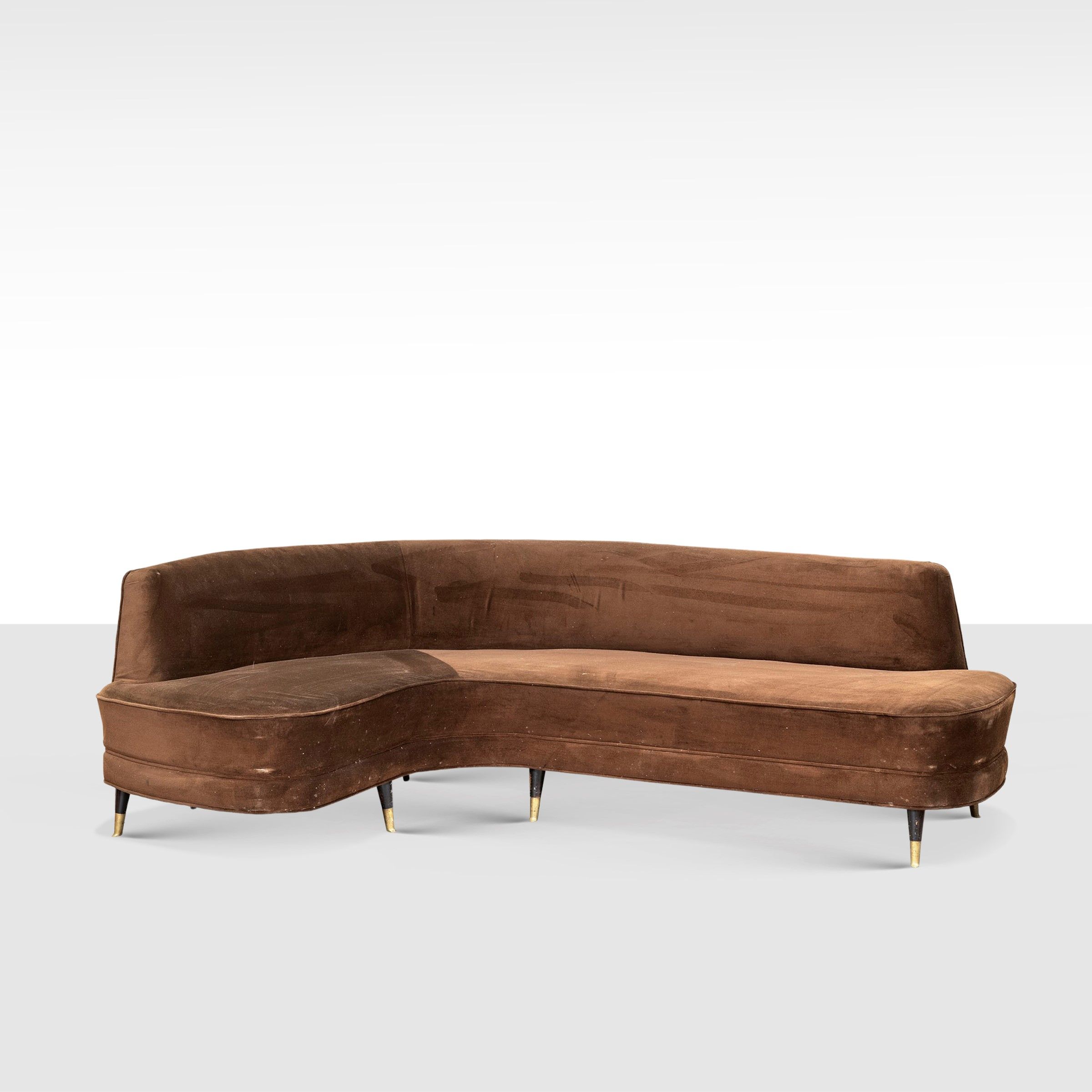 anni 50 divano curvo in legno e tessuto imbottito, difetti