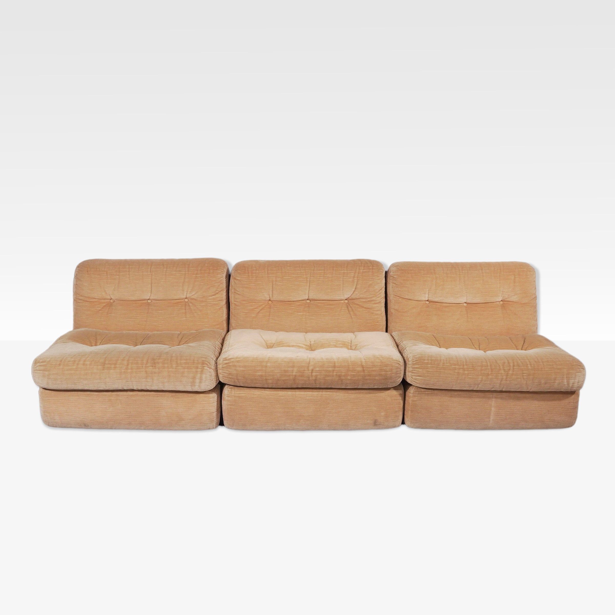 70x78x86 cm. Italia, 1966 tre poltrone mod. Amanta in fiberglass e tessuto imbottito, marchio ed etichetta della produzione, lievi usure. Bibliografia: G. Gramigna, Repertorio del design italiano 1950-2000 dell'arredo domestico, Allemandi, Torino 2021, pag. 131