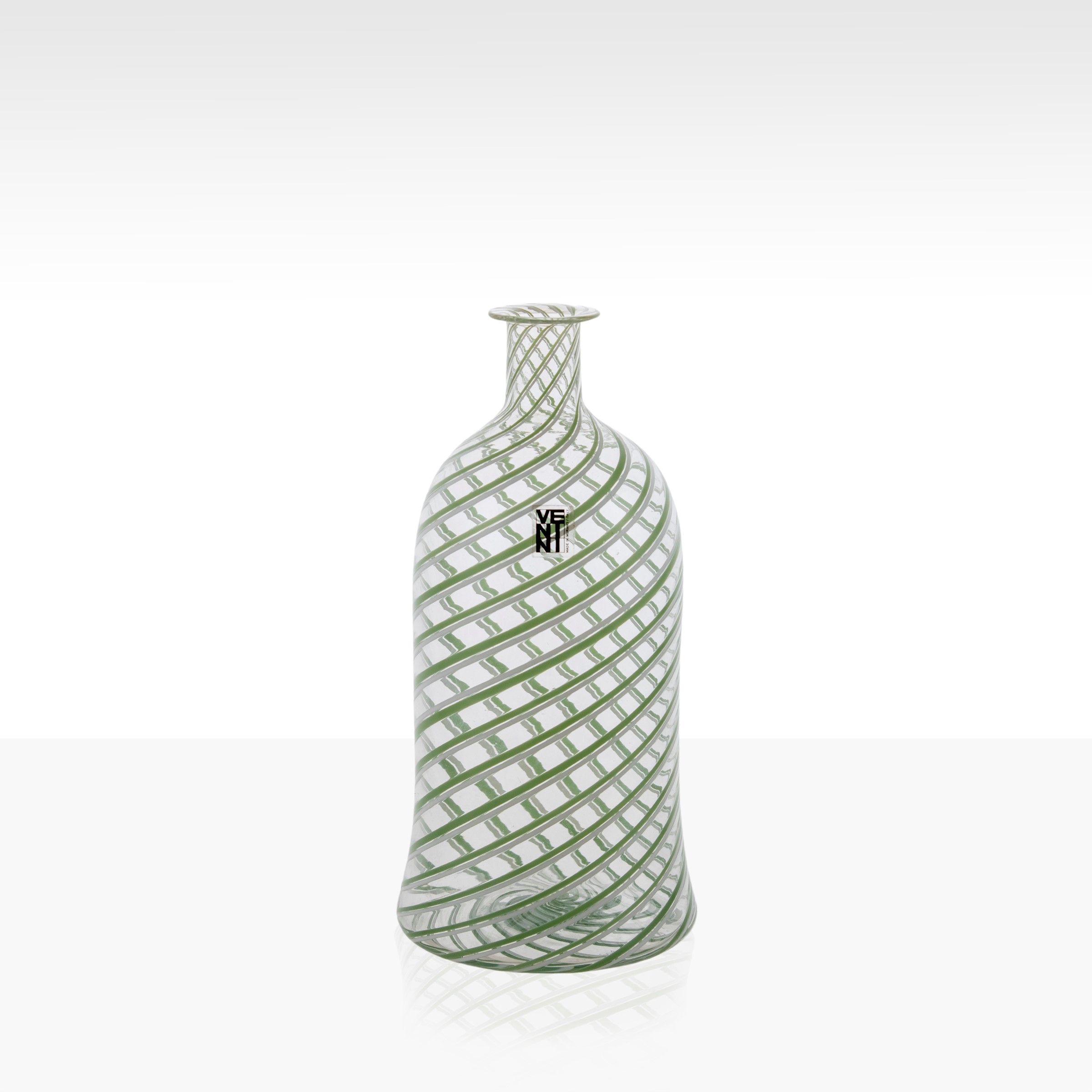 Murano, 1974 vaso a spirale in vetro color lattimo e verde erba e trasparente, firma incisa ed etichetta della produzione. Bibliografia: listino oggetti, 1974, cod. prodotto 612.13