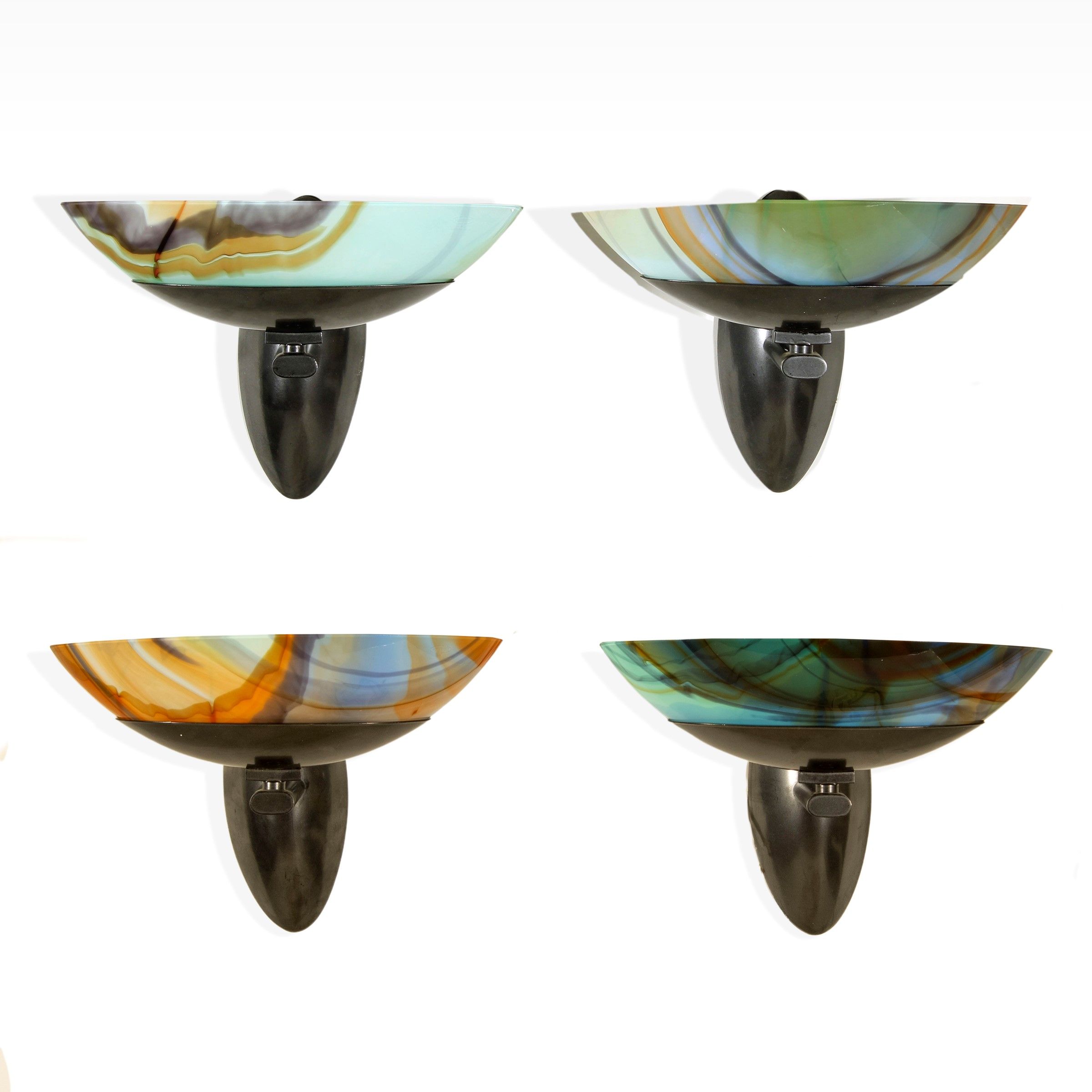 Italia, anni 80 quattro lampade da parete in metallo verniciato e vetro colorato, marchio della produzione, lievi usure