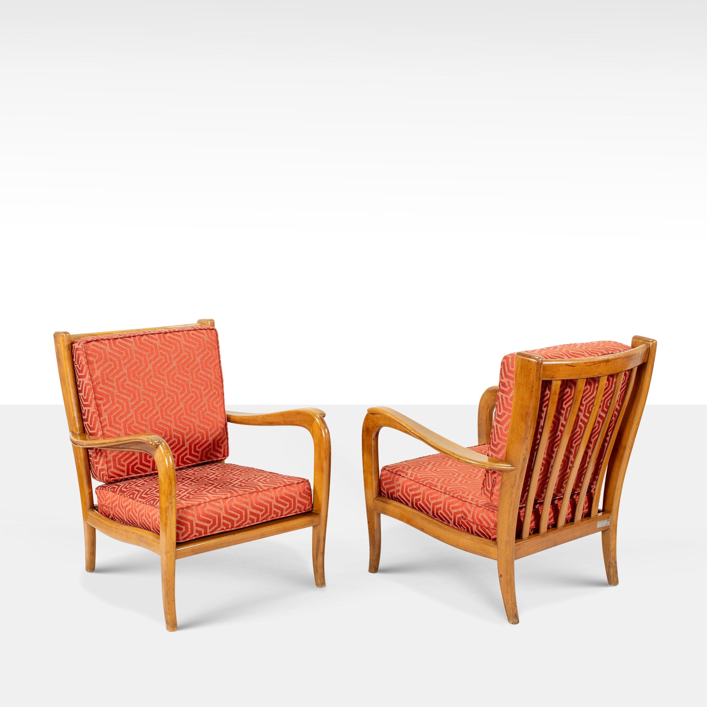 Italia, anni 50 coppia di poltrone in legno e tessuto imbottito, etichetta Istituto per le Ricerche e le Informazioni di Mercato in Agricoltura, lievi usure