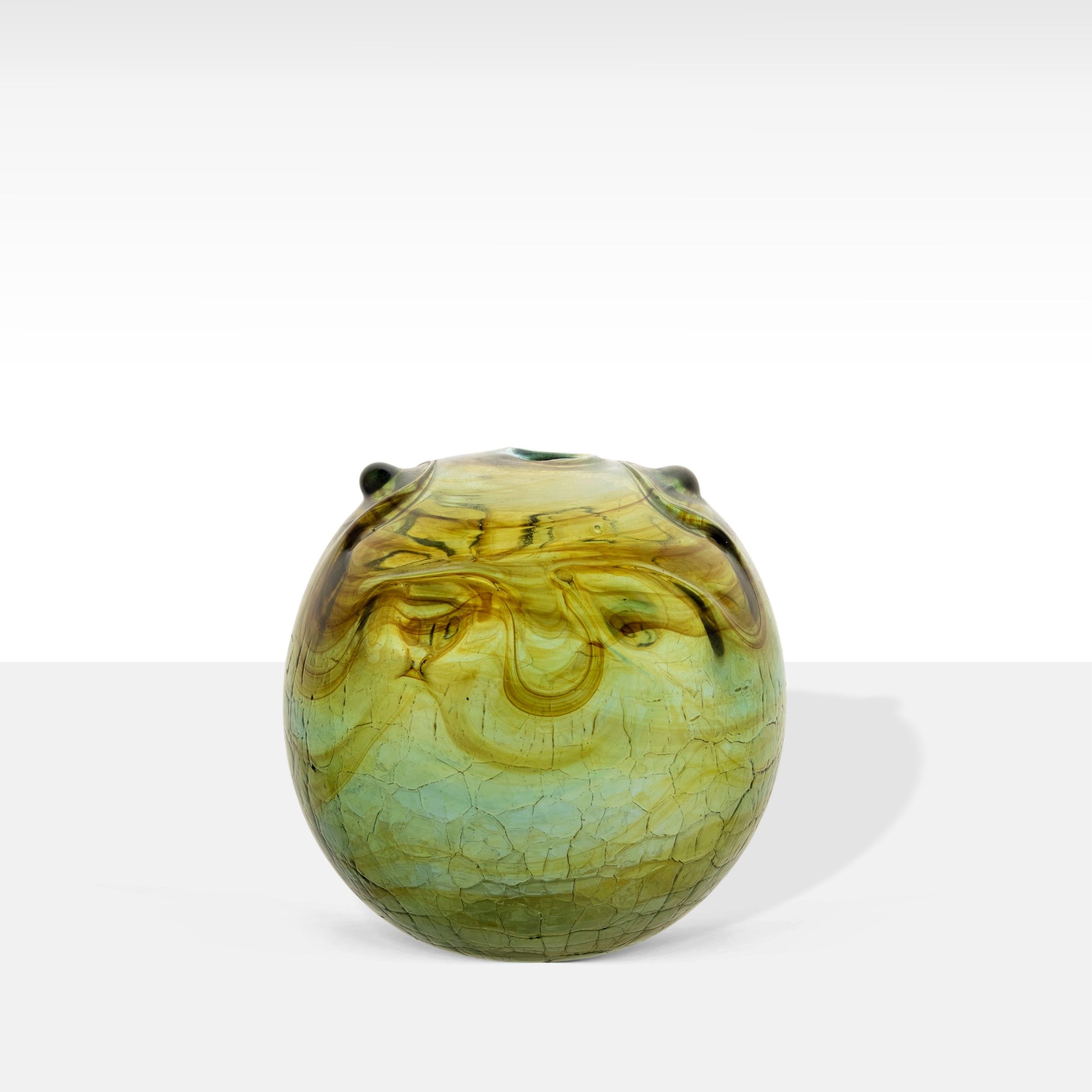 Usa, anni 60-70 vaso sferico in vetro soffiato colorato, firma e data a punta