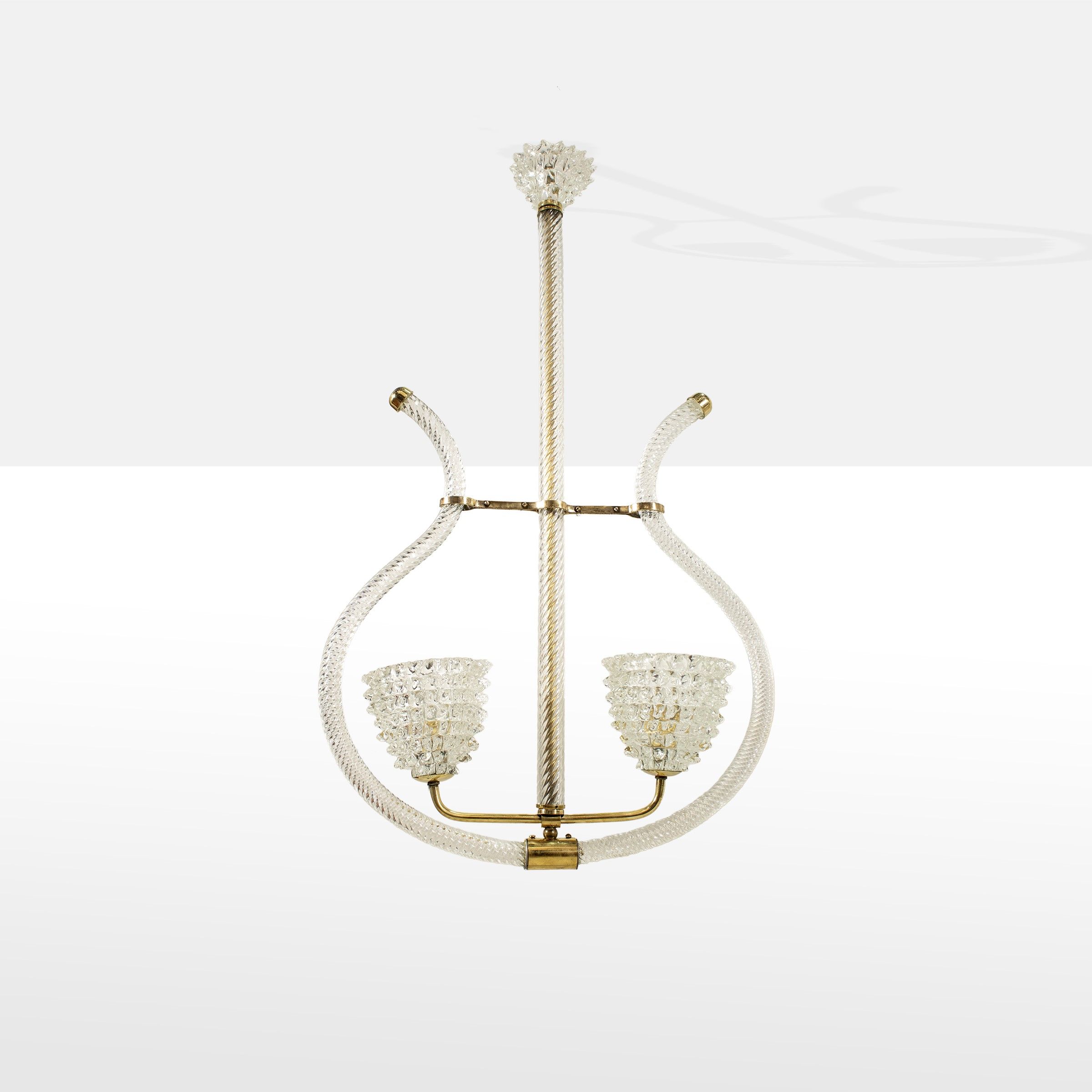 Murano, anni 40-50 lampada a sospensione in vetro rostrato trasparente ed ottone