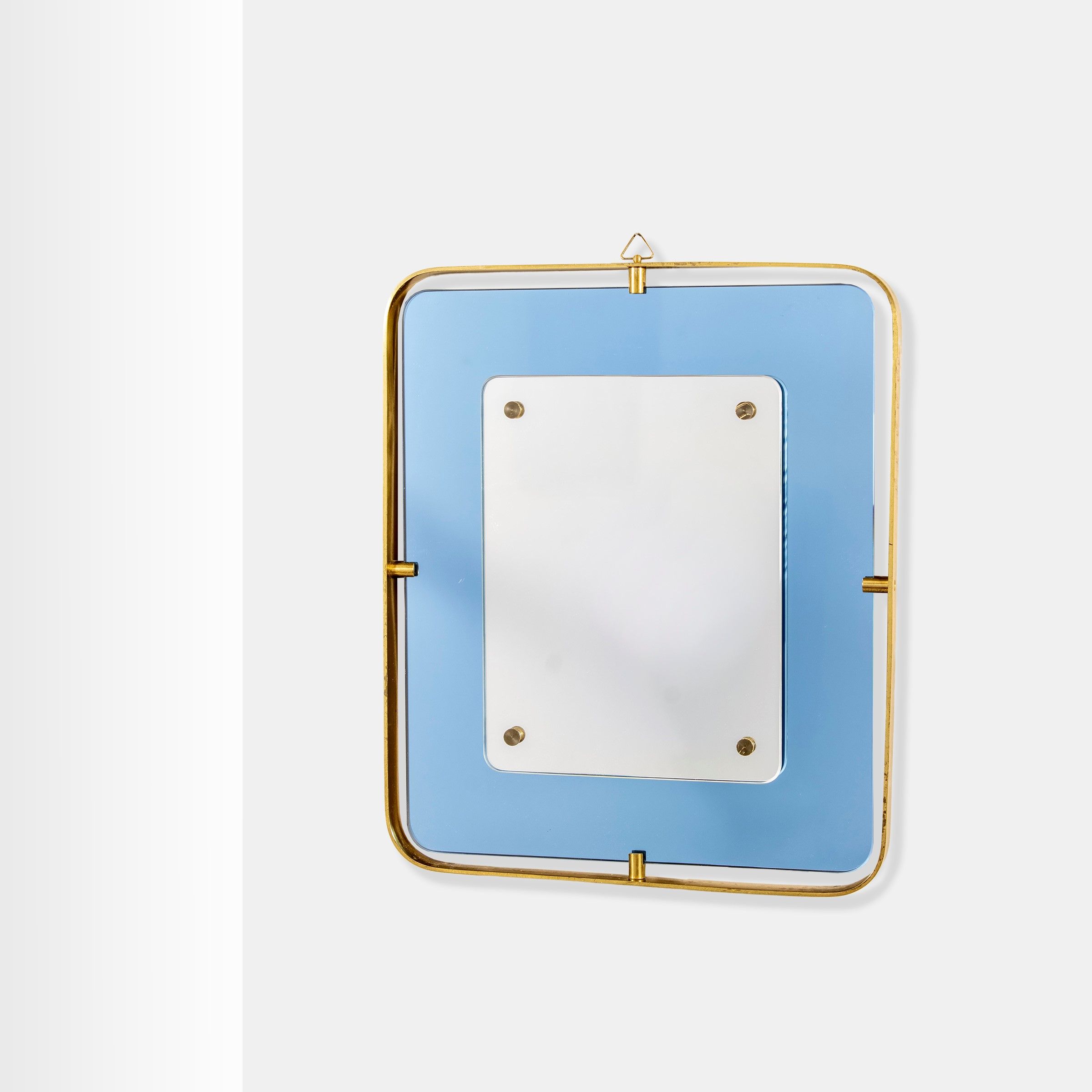 Italia, anni 50 specchio da parete in ottone, vetro specchiato e vetro colorato