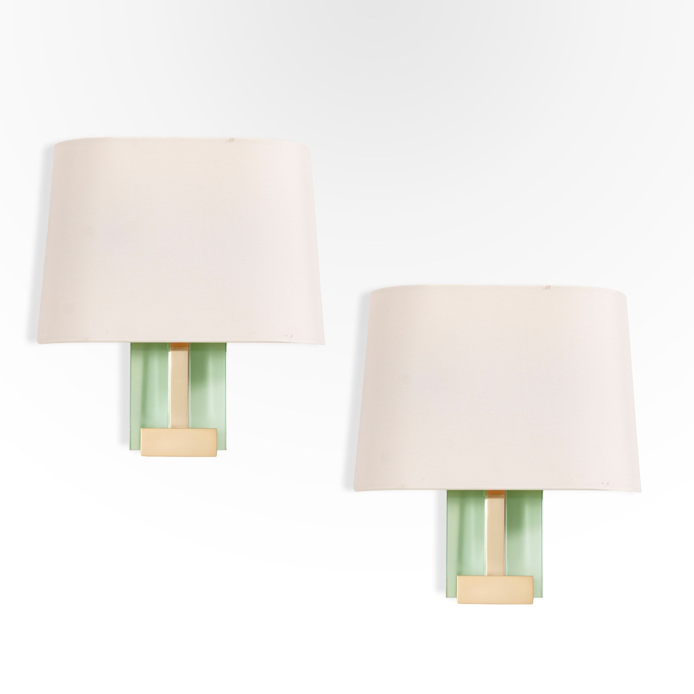 Italia, anni 60 circa coppia di lampade da parete in ottone e vetro trasparente, complete di paralume, etichetta della produzione