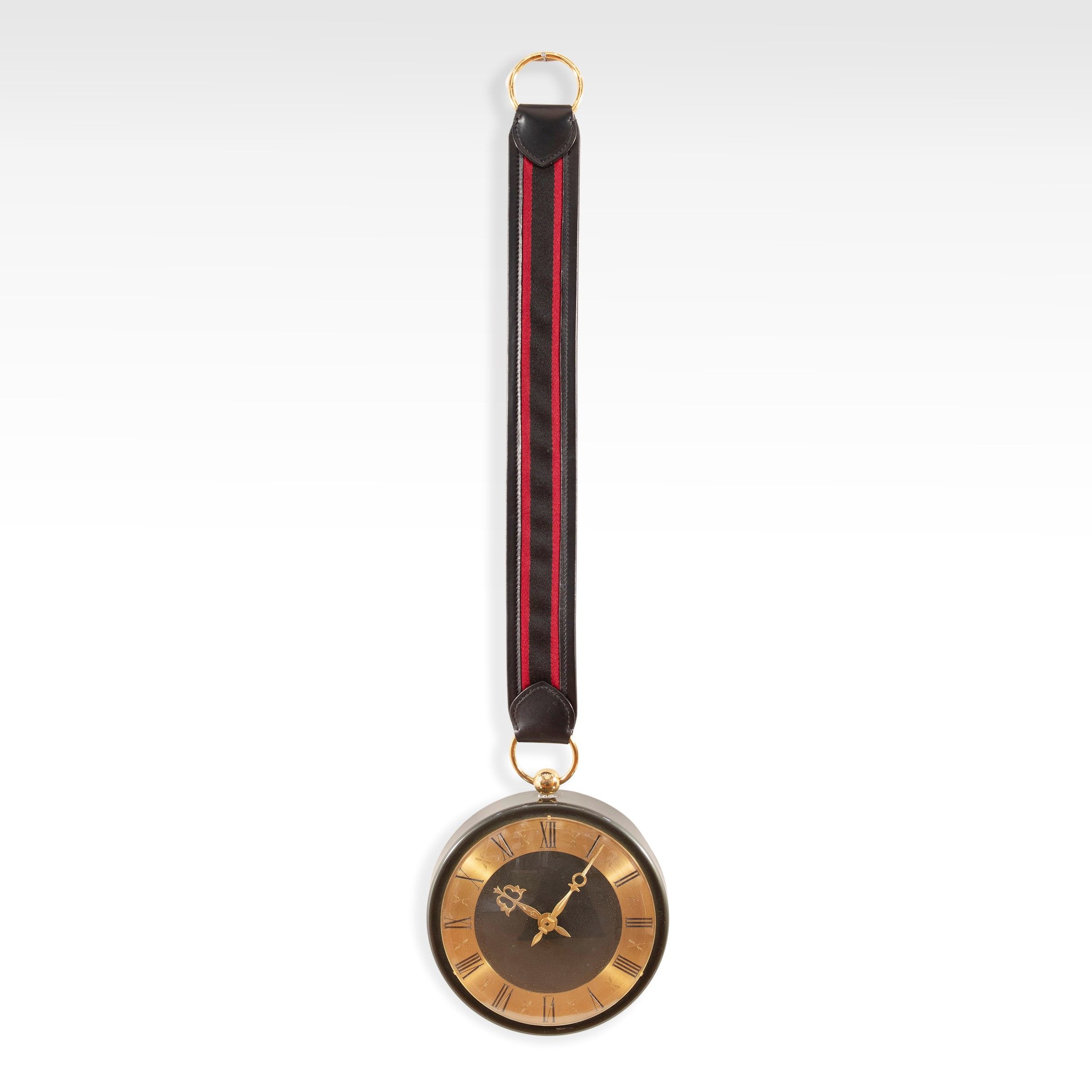 Italia, anni 80 orologio da parete in metallo, ottone, similpelle e tessuto, firmato, da revisionare