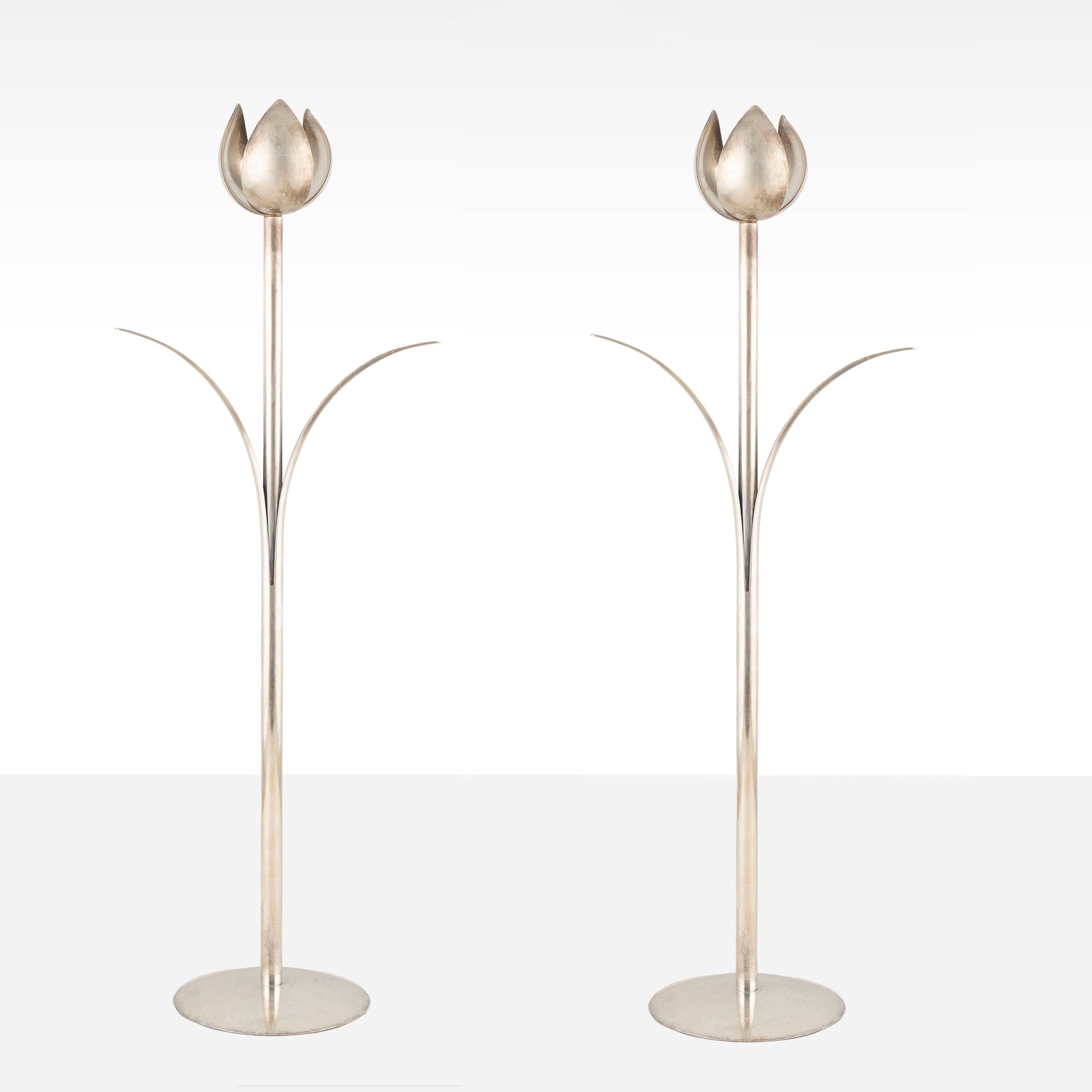 Italia, anni 80 coppia di candelieri in metallo argentato, marchio della produzione