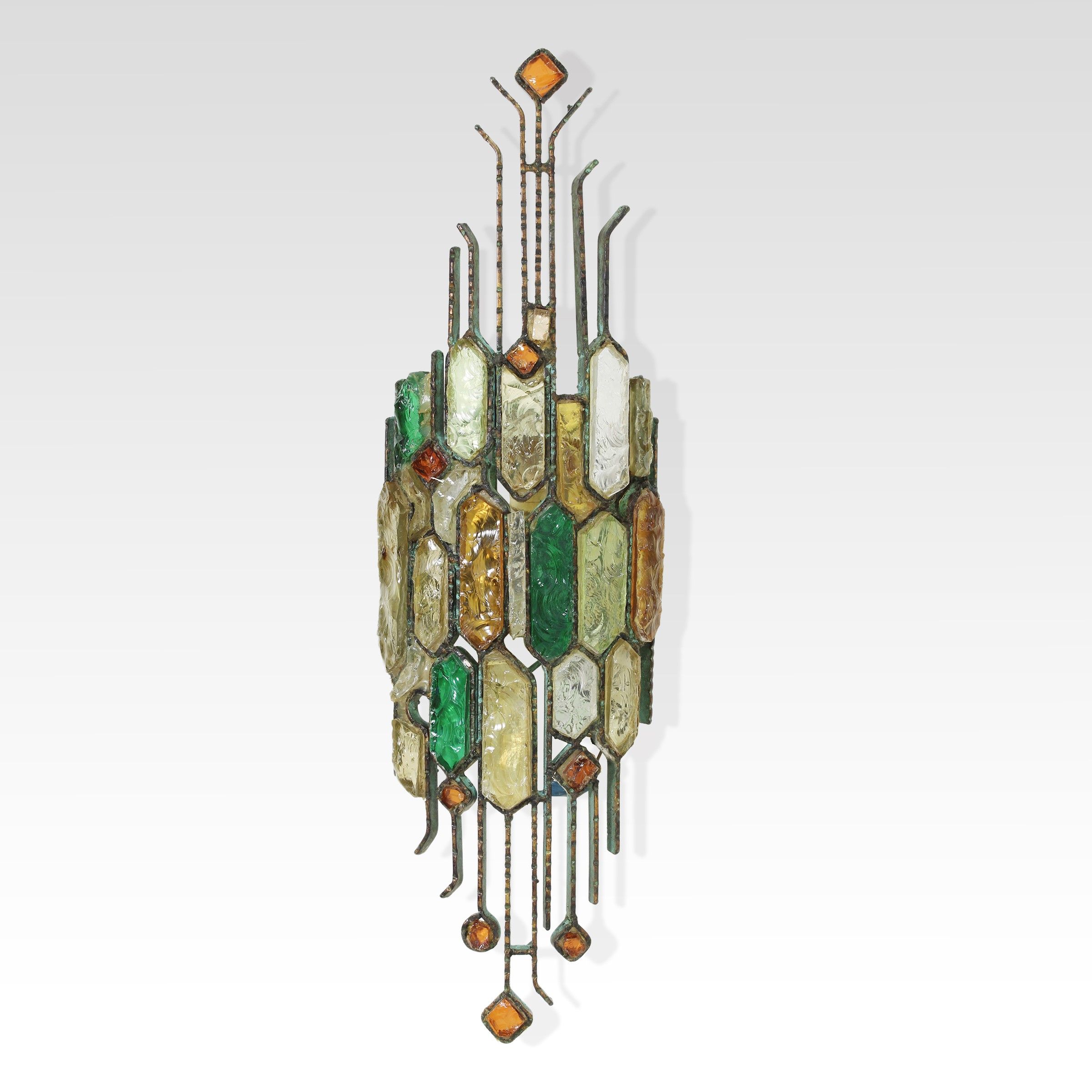 Italia, anni 70 lampada da parete in rame, vetro colorato e vetro trasparente