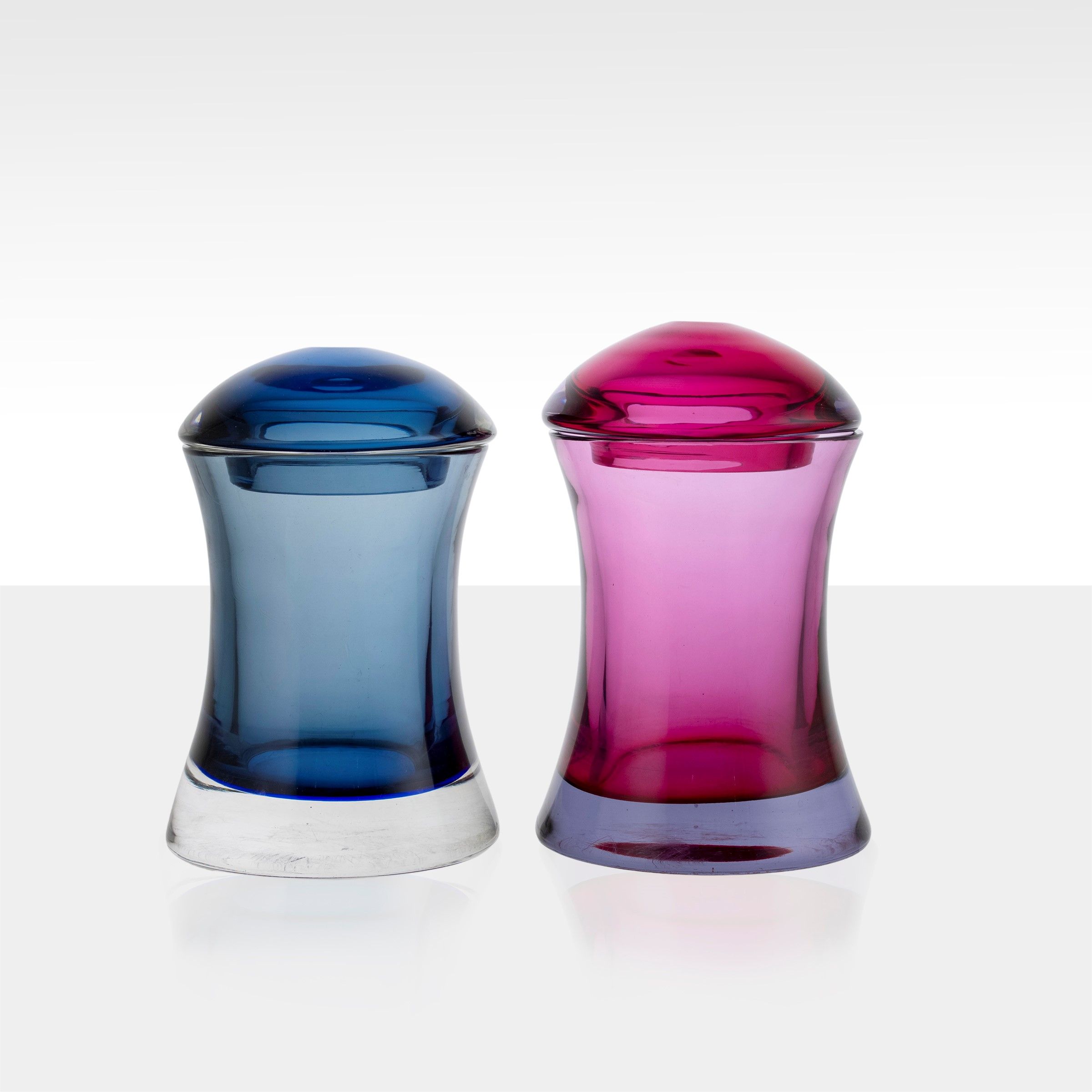 Murano, anni 50 coppia di vasi con coperchio in vetro sommerso colorato