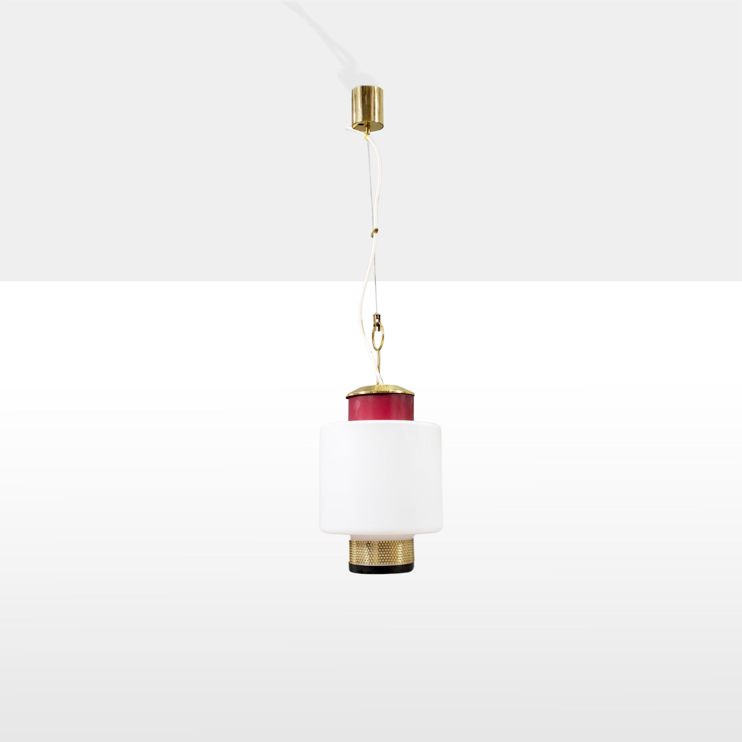 Italia, anni 50 lampada a sospensione mod. 8052 in ottone, acciaio, metallo verniciato e vetro satinato bianco e colorato, etichetta della produzione. Bibliografia: T. Bräuniger, Stilnovo, apparecchi per l'illuminazione, Éditions Luminaires, Modernistes, 2016