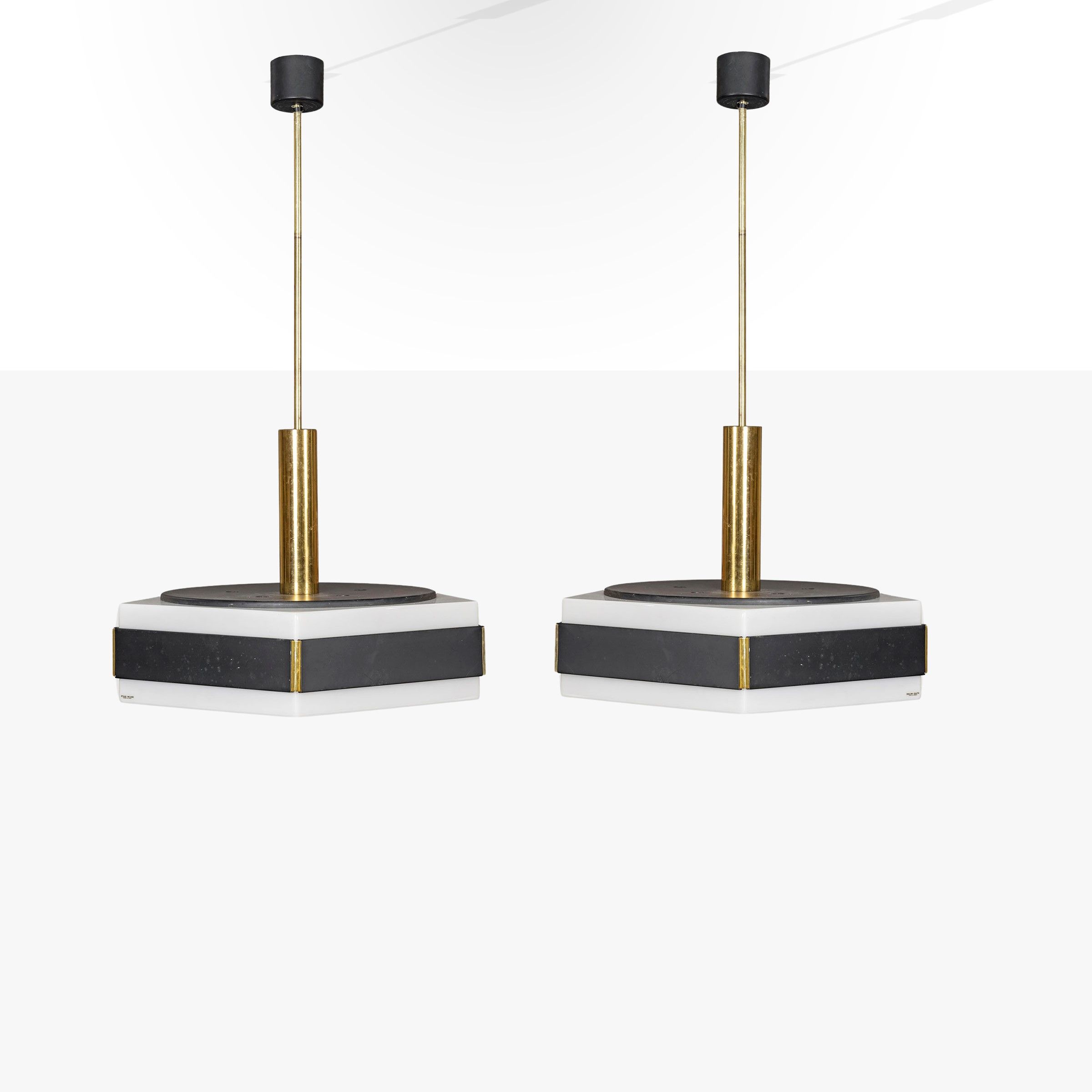 Italia, anni 60 coppia di lampade a sospensione in ottone, metallo verniciato e perspex, marchio della produzione