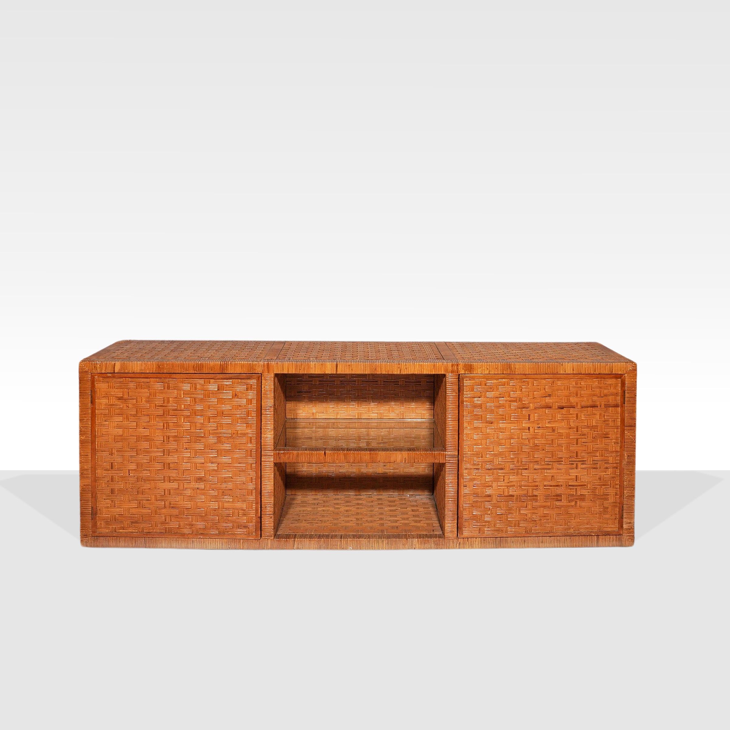 Italia, anni 70 sideboard in legno, midollino e vetro trasparente, usure