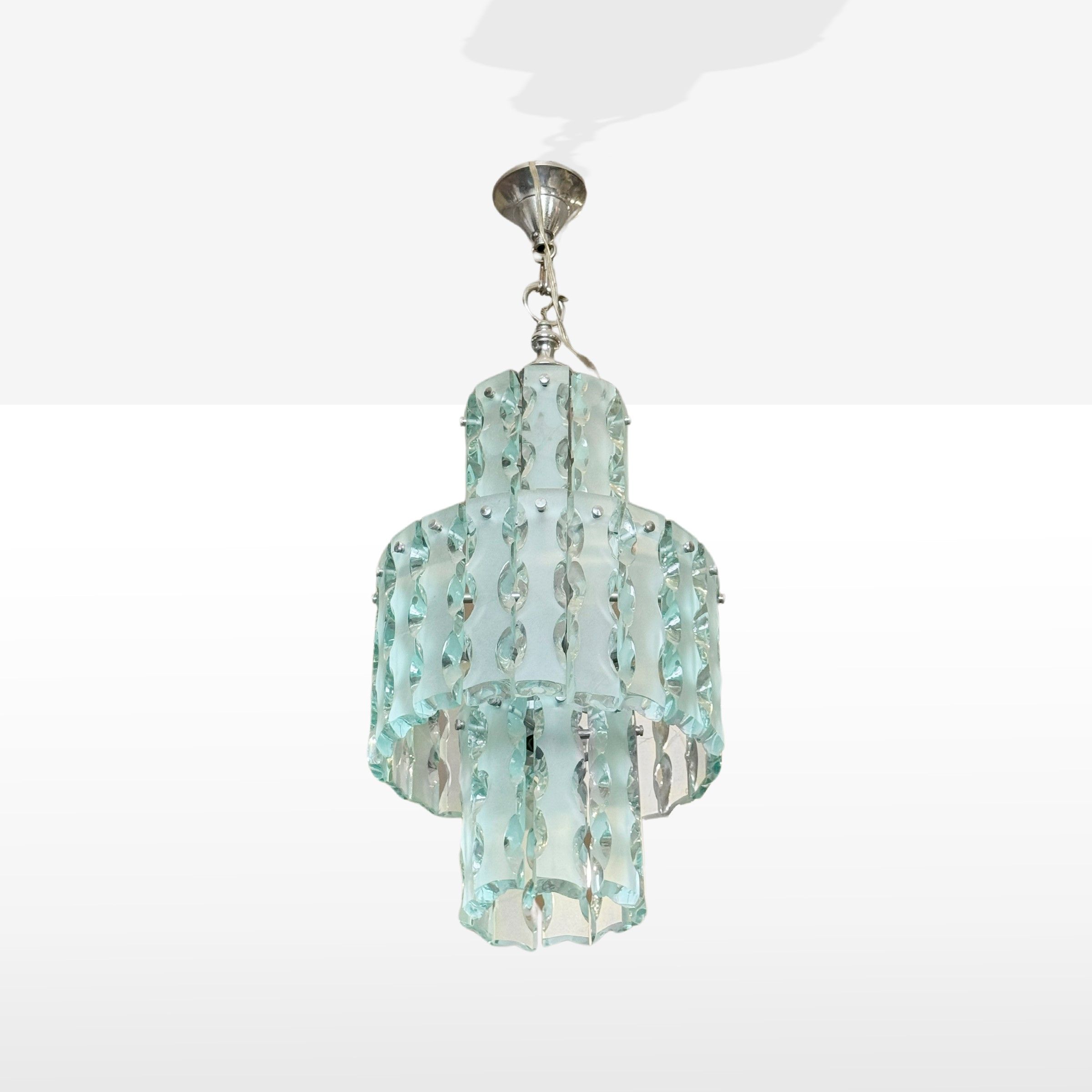 Italia, anni 60-70 lampada a sospensione in metallo cromato, cristallo molato e satinato