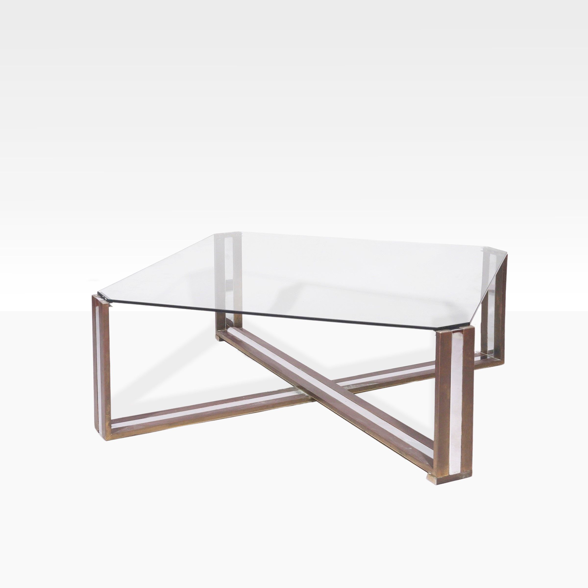 Italia, anni 70 tavolino basso in metallo, ottone e vetro trasparente, lievi usure