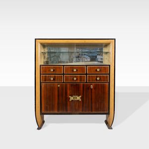150x128x40 cm. Italia, anni 40 credenza in legno, ottone, vetro trasparente e vetro specchiato, lievi usure