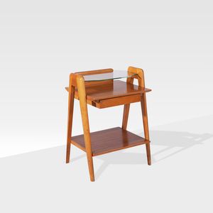 60x45x35 cm. Italia, anni 50 comodino in legno e vetro trasparente, lievi usure