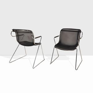 81x65,5x63 cm. Italia, 1982 due sedie mod. Penelope in acciaio cromato e metallo verniciato, lievi usure