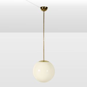 h. 138 cm. Italia, anni 50 lampada a sospensione in ottone e vetro lattimo, usure