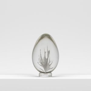 h. 10,7 cm. Murano, 1969 uovo serie Fiammante in vetro trasparente e fiamma sommersa color lattimo, completo di [..]