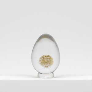 h. 8,6 cm. Murano, 1966 uovo in vetro trasparente e palla dorata sommersa, completo di base in vetro, firma incisa [..]
