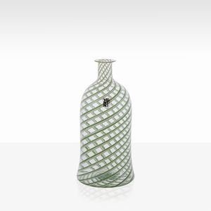 h. 22,7 cm. Murano, 1974 vaso a spirale in vetro color lattimo e verde erba e trasparente, firma incisa ed etichetta [..]