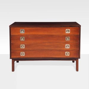 70x100x45 cm. Italia, anni 60 cassettiera in legno ed acciaio, etichetta della produzione, lievi usure