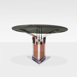 74x120 cm. anni 70 tavolo circolare in metallo cromato, metallo verniciato e vetro fumè
