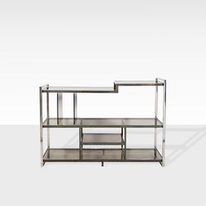 94x130x43 cm. Italia, anni 70 etagere in acciaio cromato, ottone e vetro fumé, lievi usure